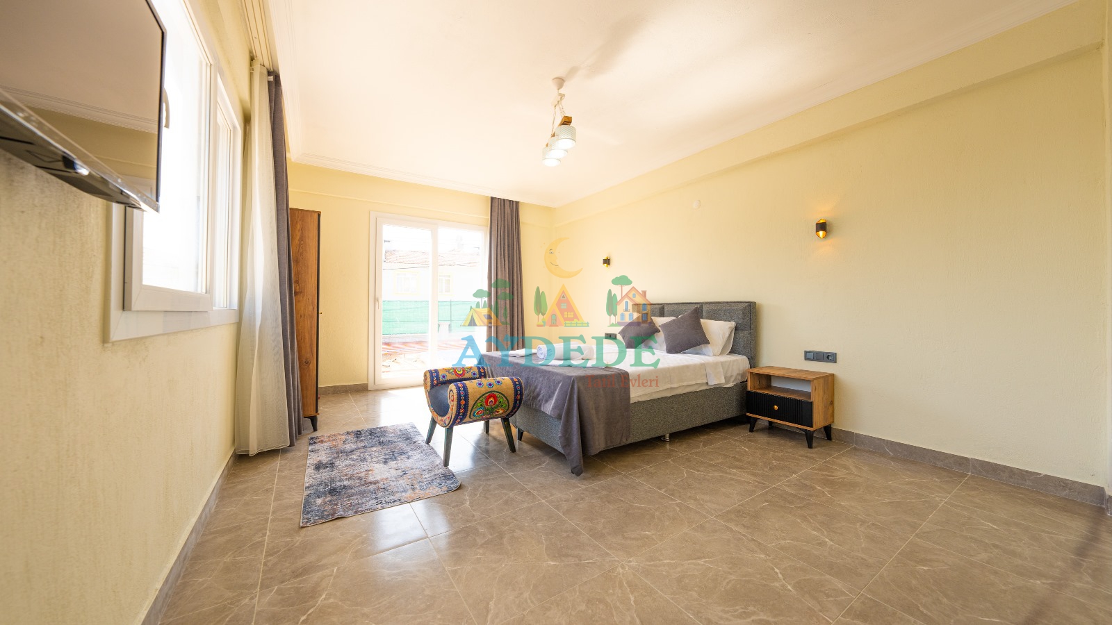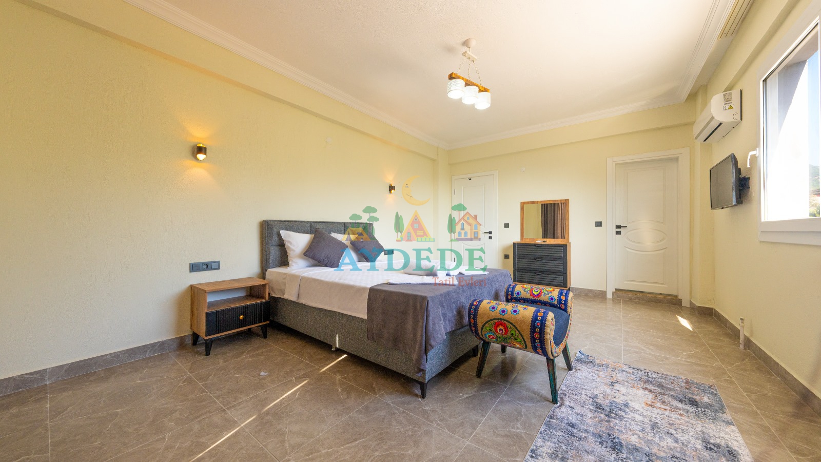 Çift kişilik yatak, klima, TV