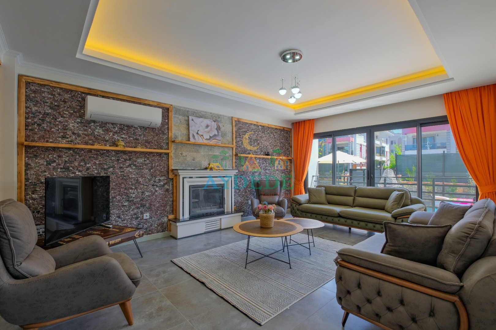 • TV, modern oturma grubu, şömine