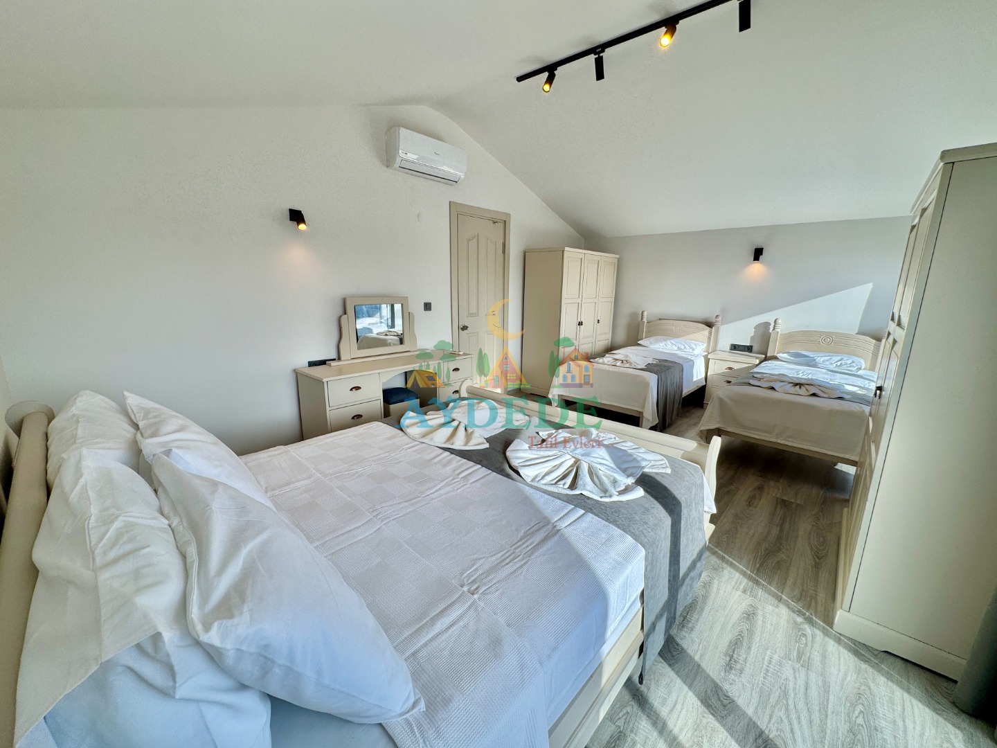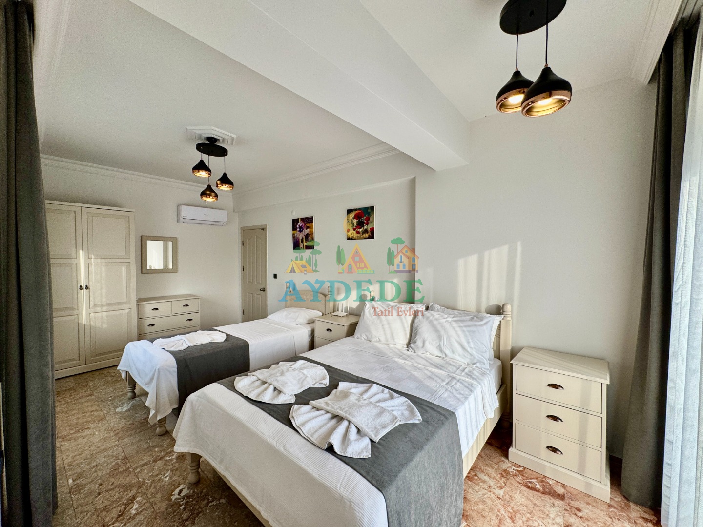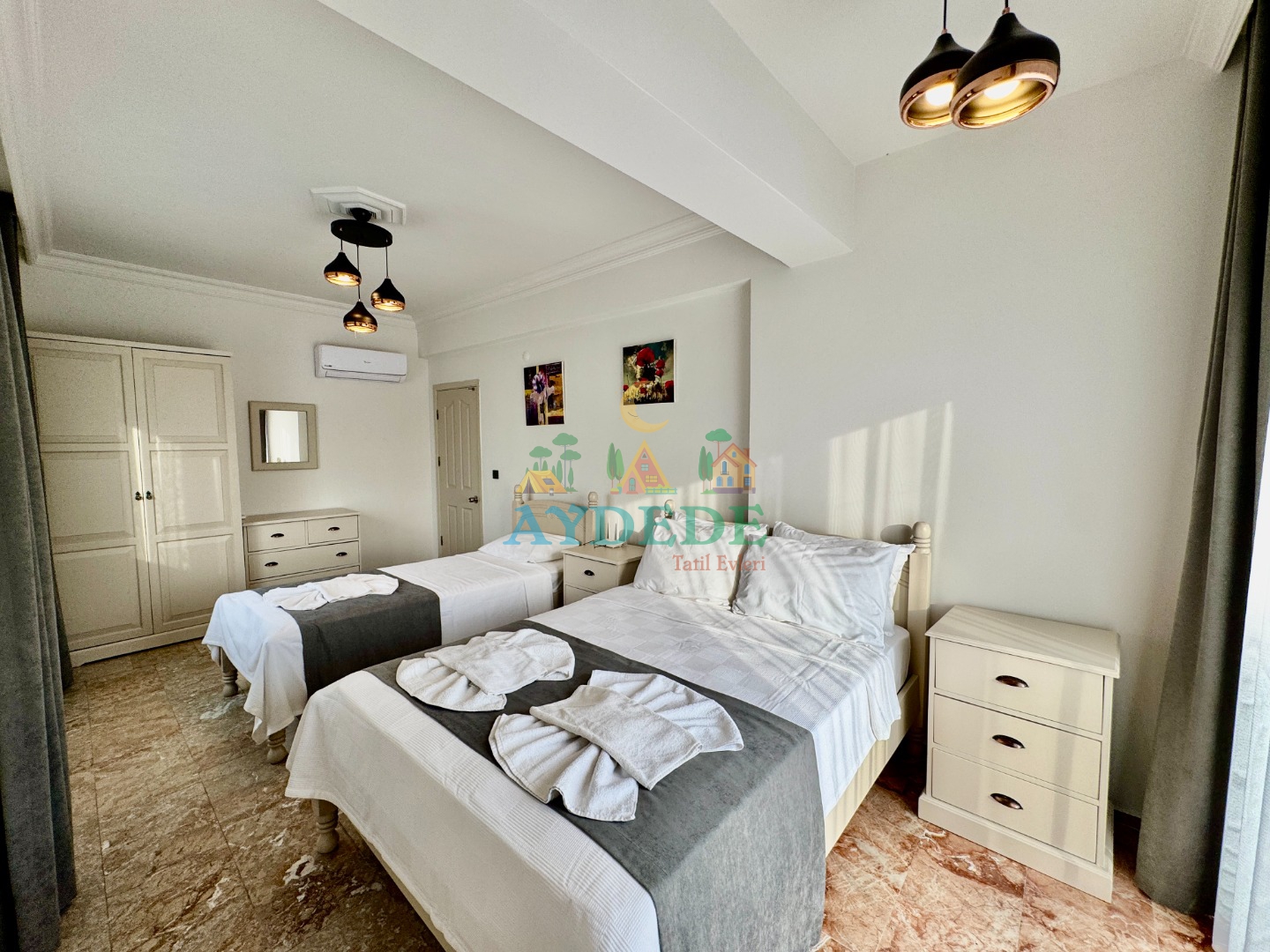 1 çift kişilik yatak + 2 tek kişilik yatak, klima