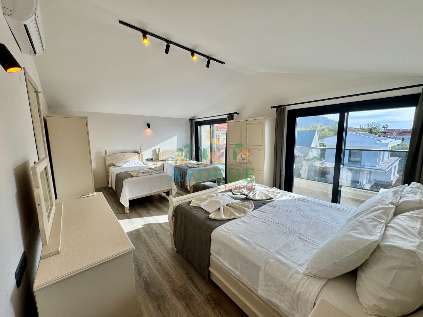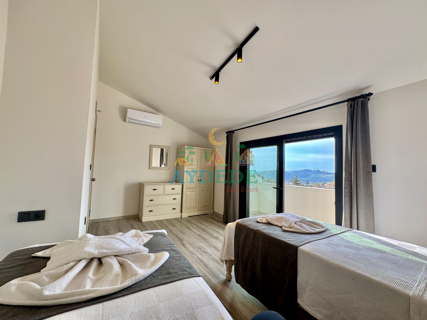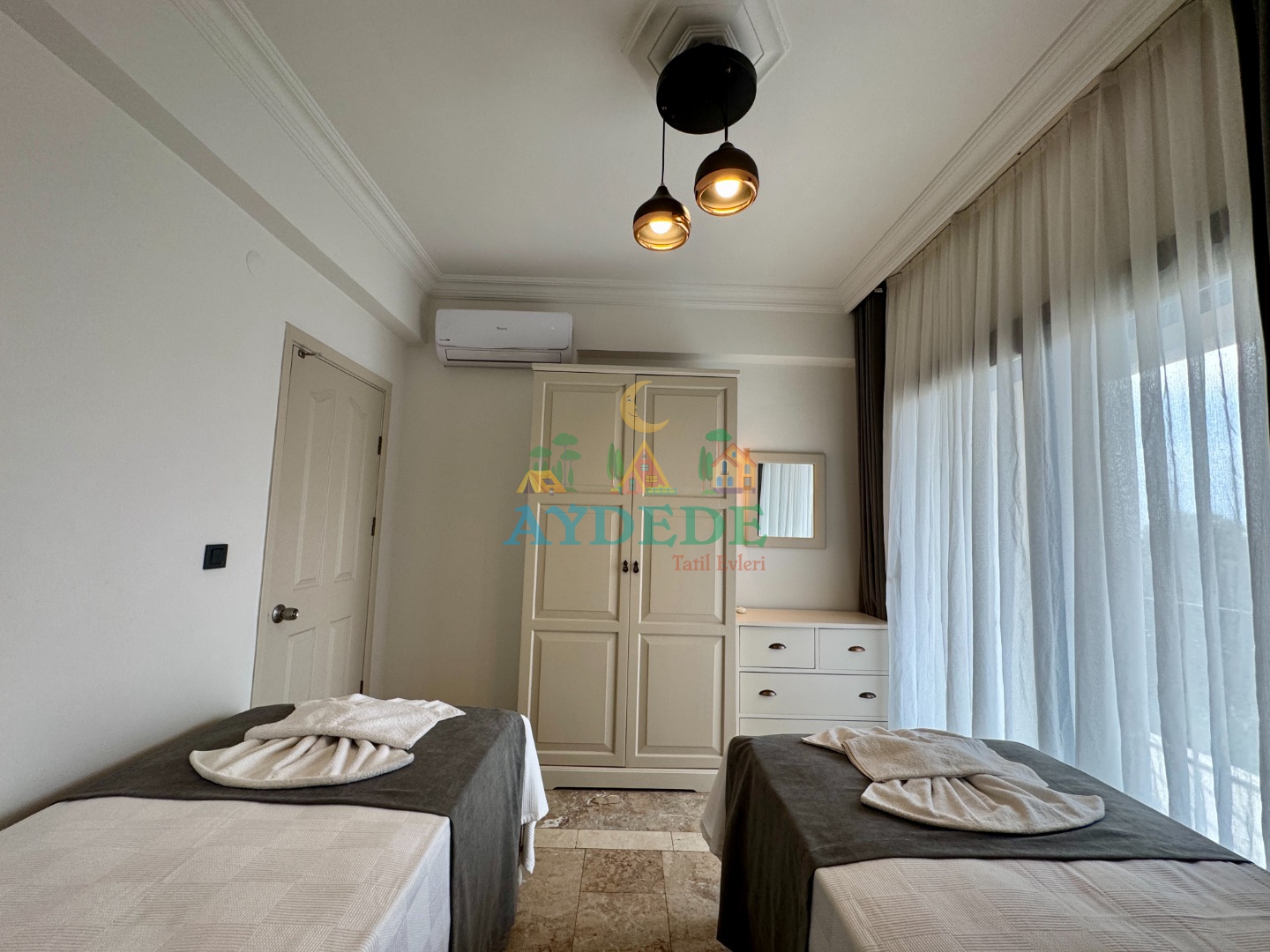 1 çift kişilik yatak + 2 tek kişilik yatak, klima
