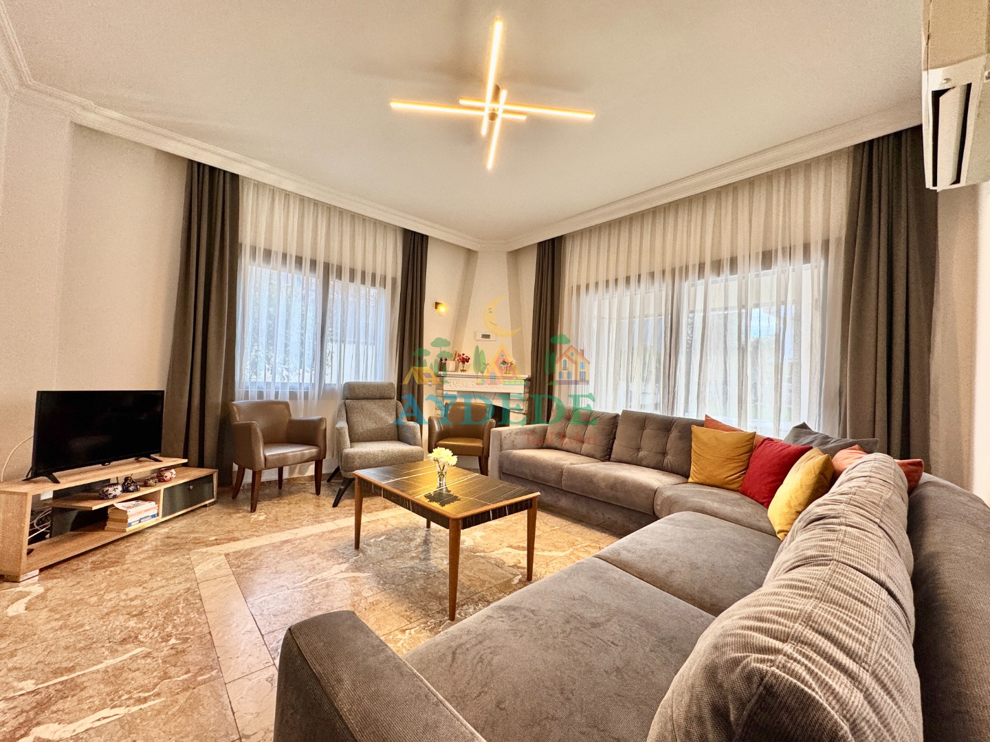 • Salonda klima, TV, modern oturma grubu, şömine ve yemek alanı
