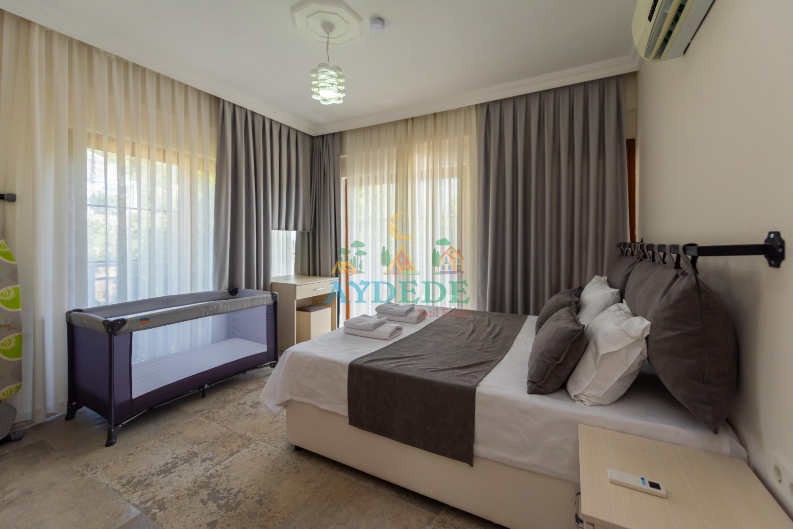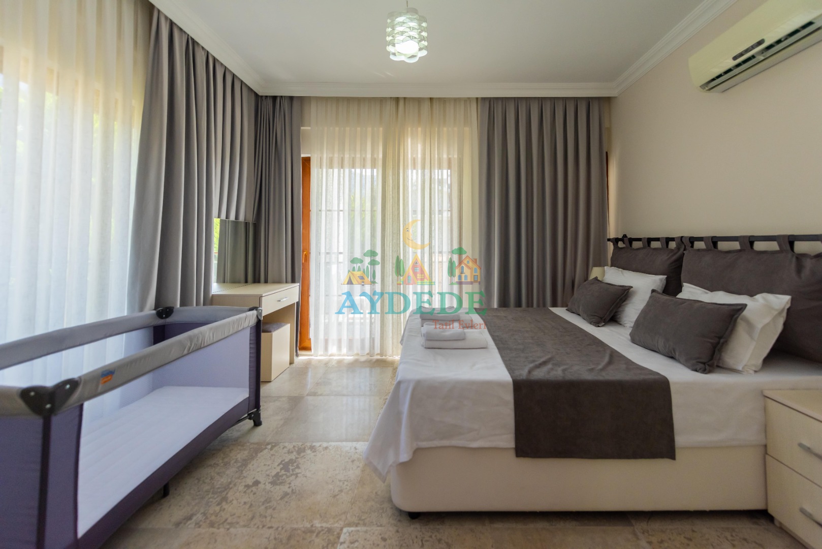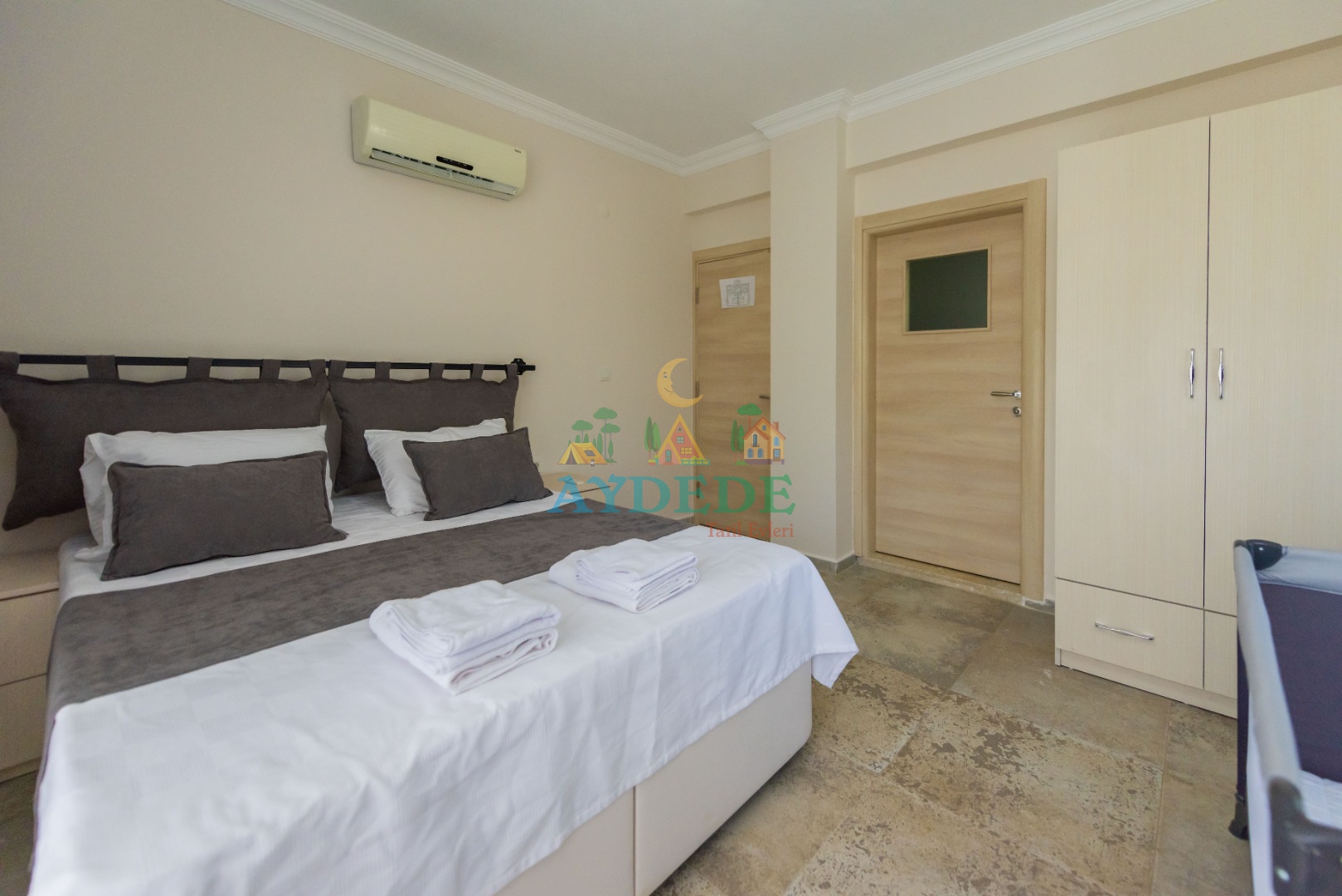 Çift kişilik yatak, ebeveyn banyo, klima, bebek yatağı