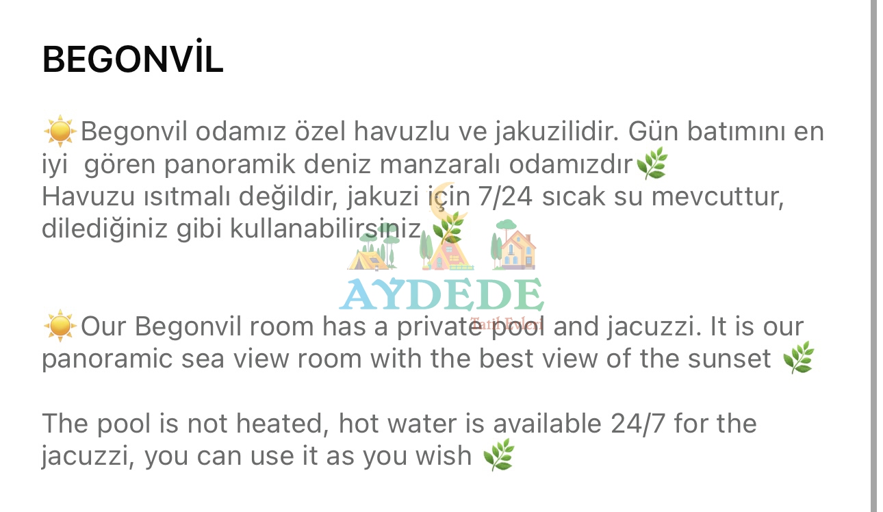 ▪️ Özel havuzlu ve jakuzili  odaları olan, kişiye özel hizmet veren butik balayı otelidir.