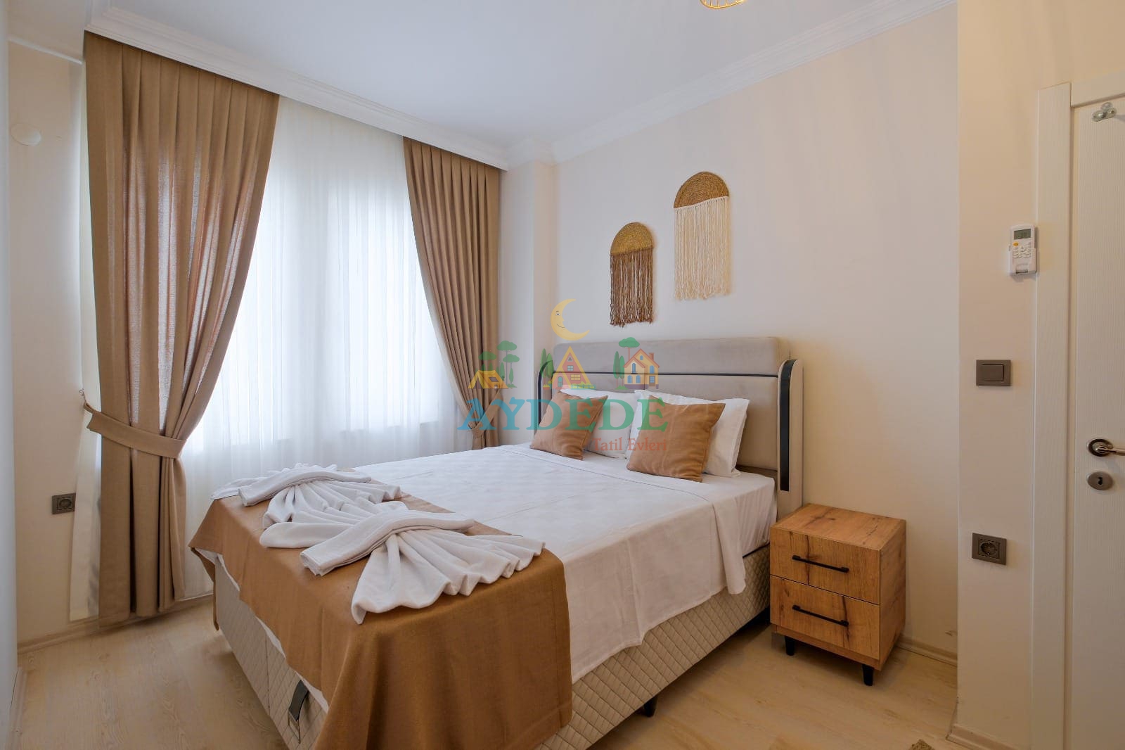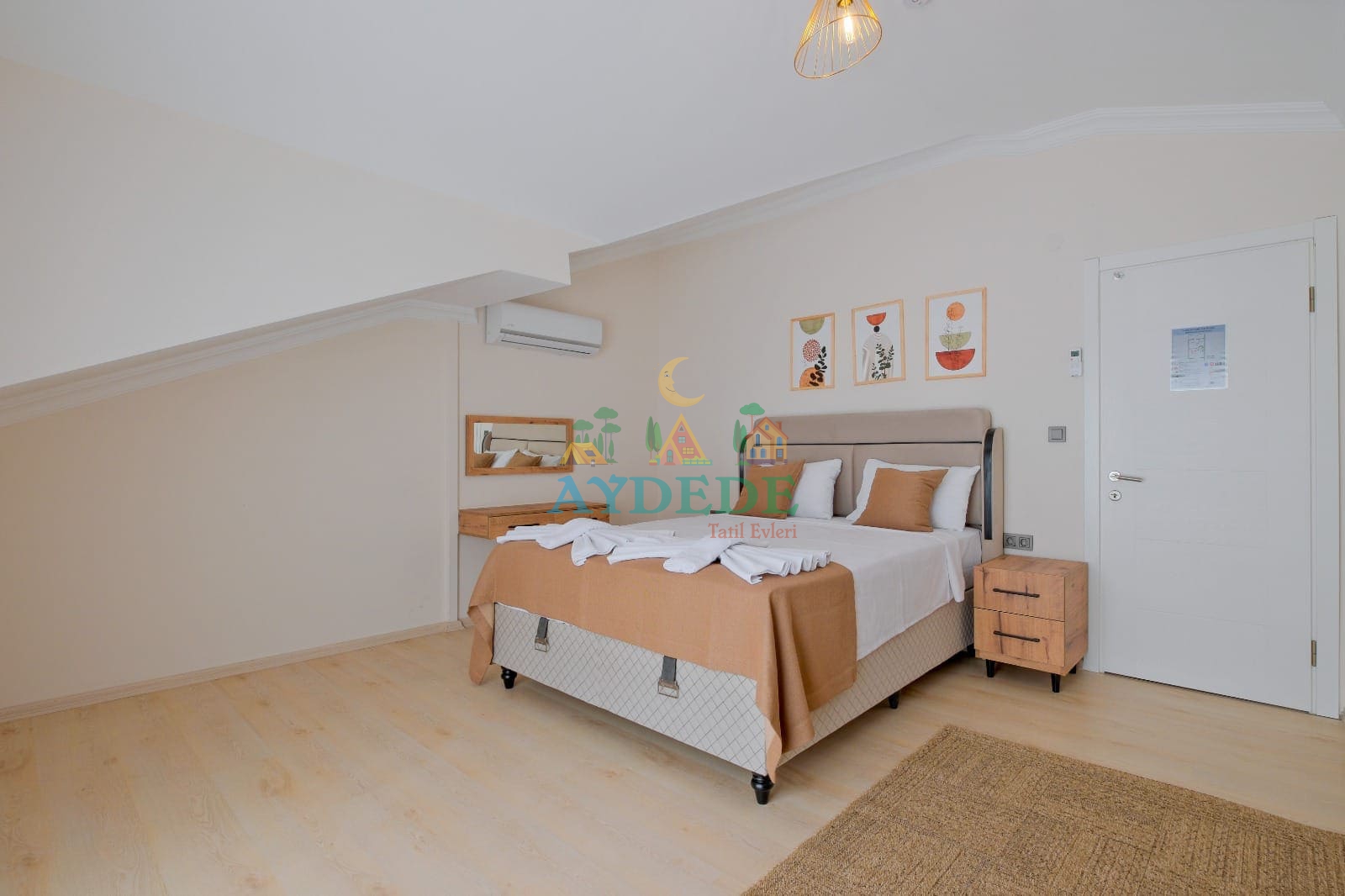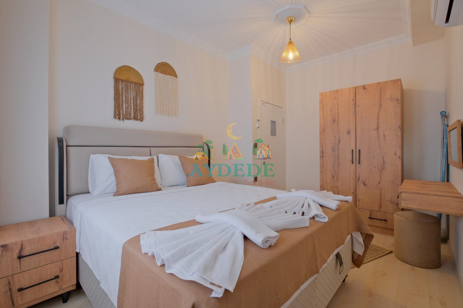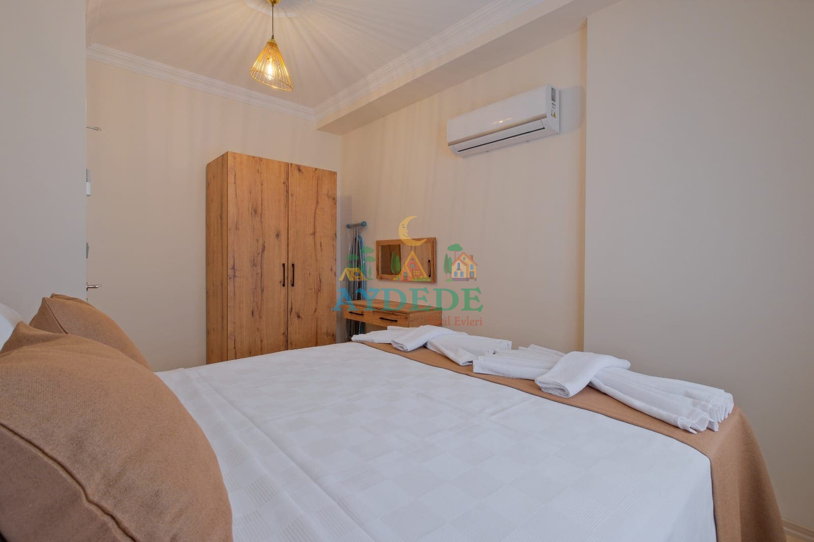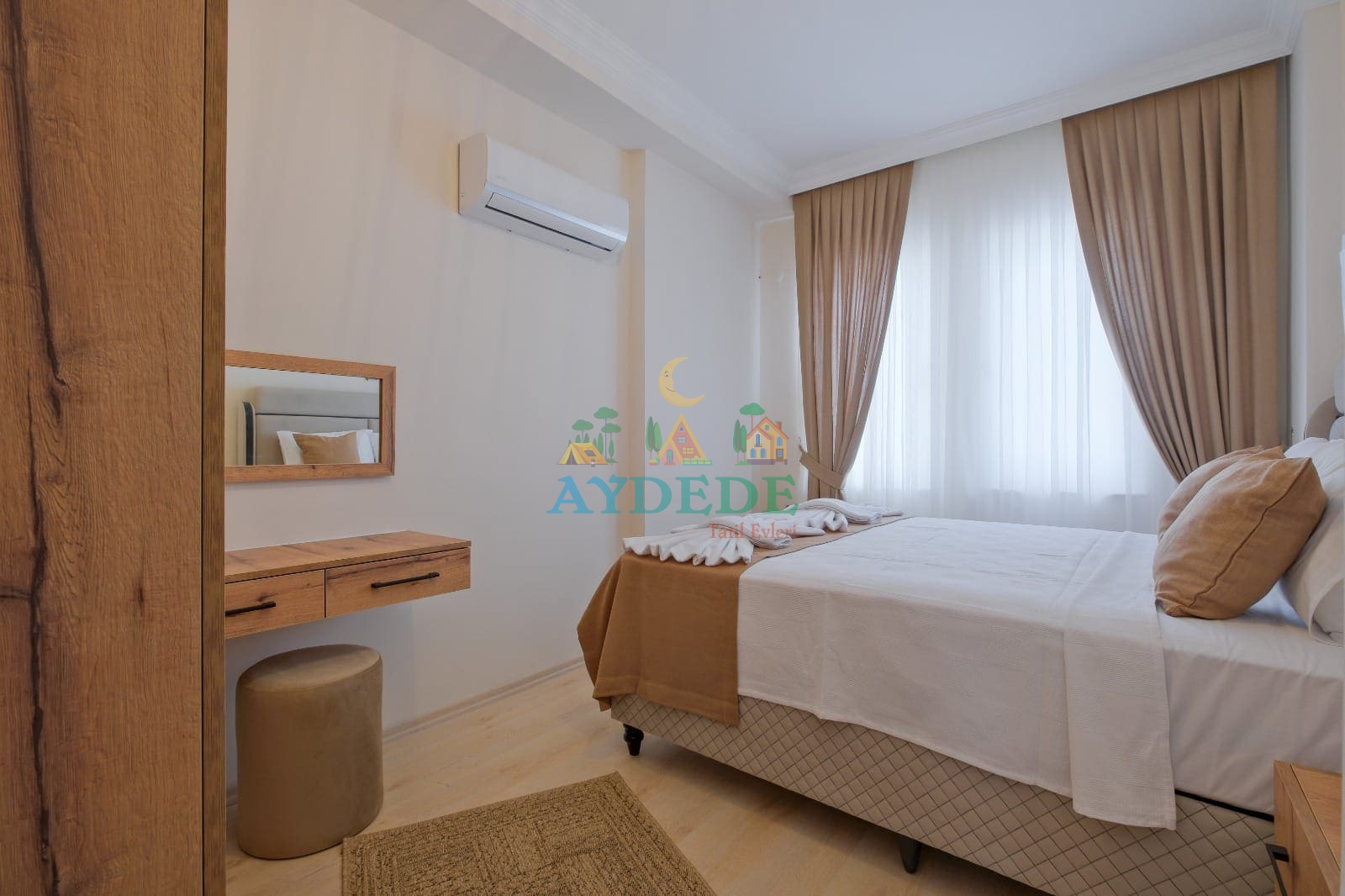 Çift kişilik yatak, klima, makyaj masası