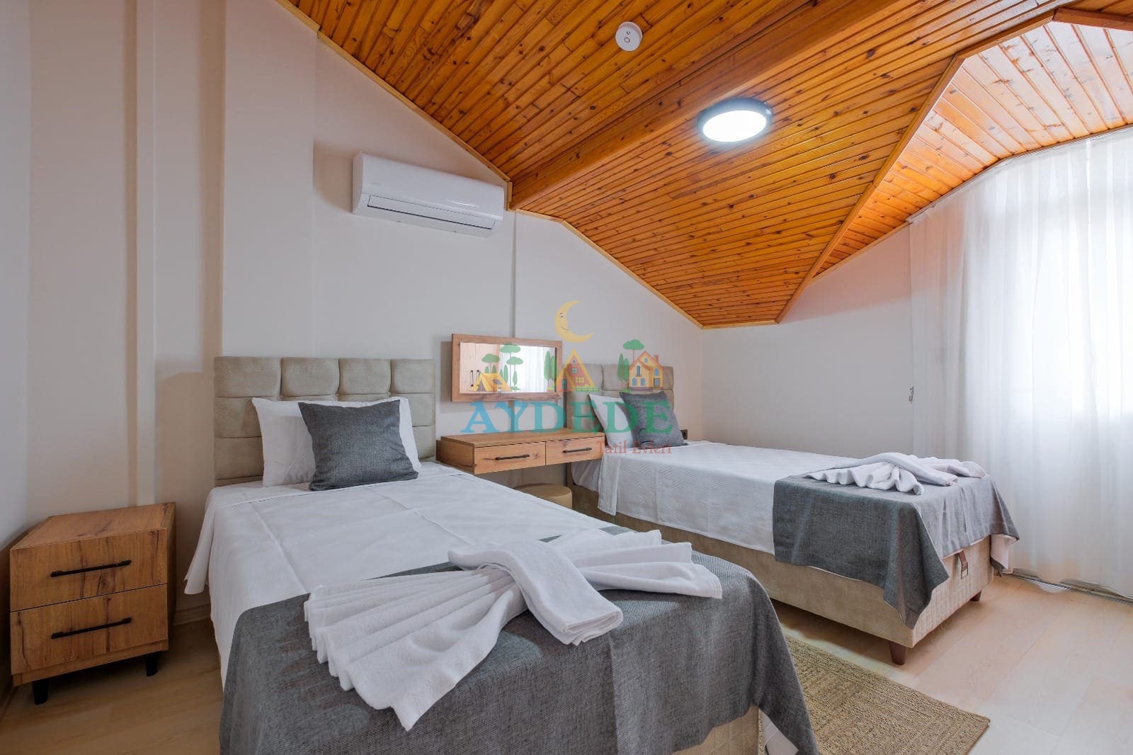 2 adet tek kişilik yatak, klima, makyaj masası, teras