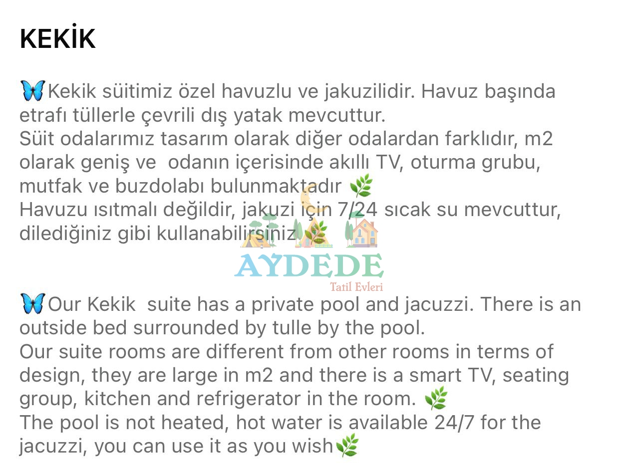 ▪️ Özel havuzlu ve jakuzili odaları olan, kişiye özel hizmet veren butik balayı otelidir.