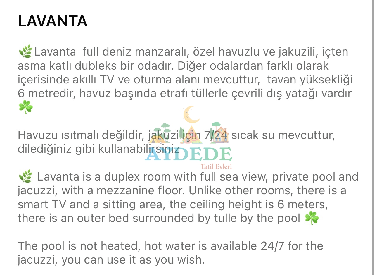 ▪️ Özel havuzlu ve jakuzili  odaları olan, kişiye özel hizmet veren butik balayı otelidir.