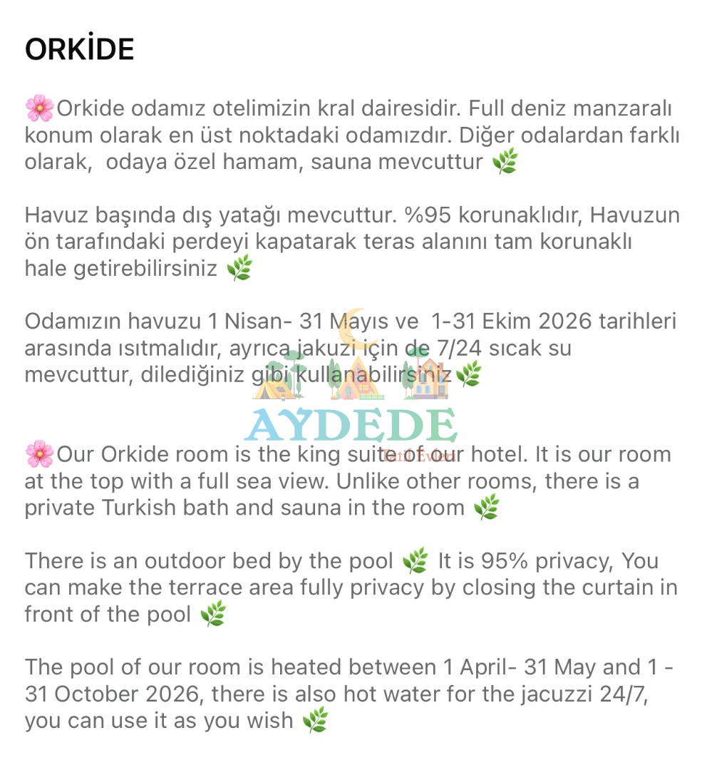 ▪️ Özel havuzlu ve jakuzili  odaları olan, kişiye özel hizmet veren butik balayı otelidir.