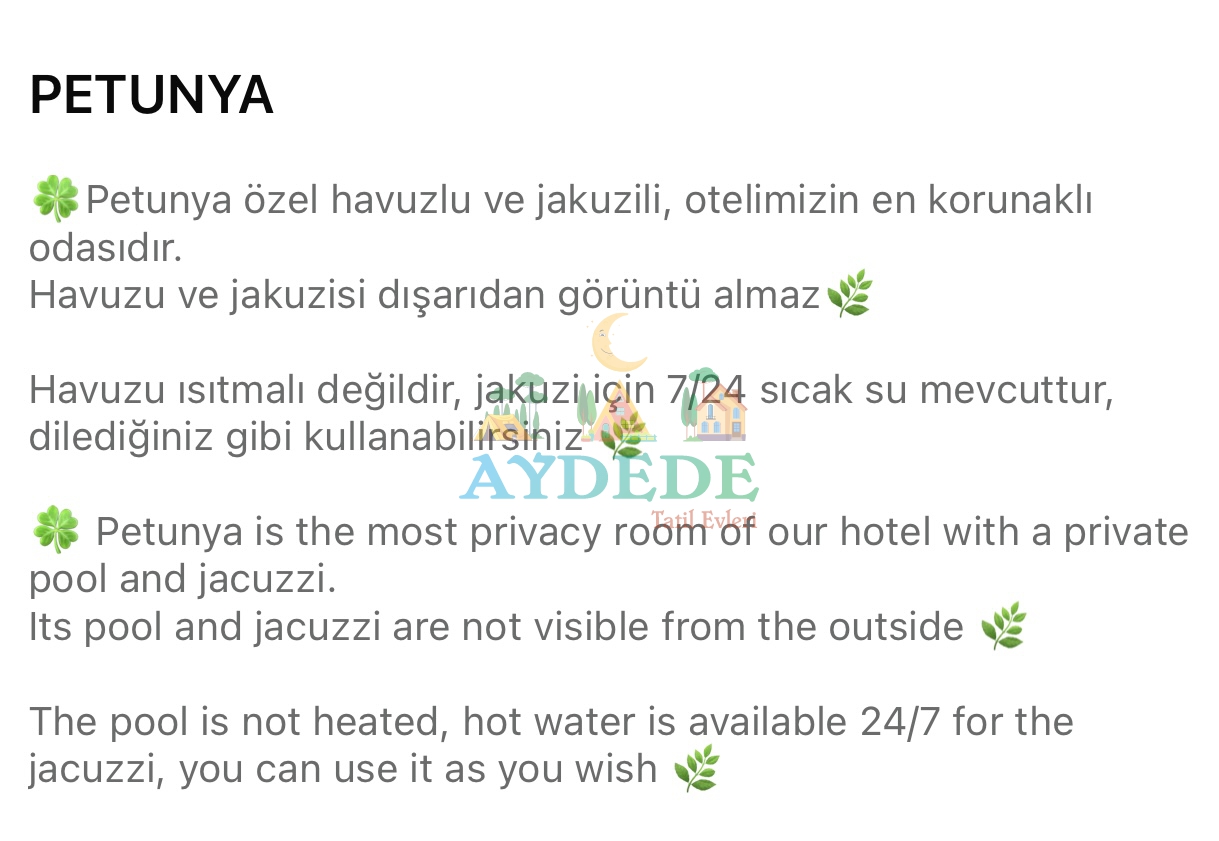 ▪️ Özel havuzlu ve jakuzili  odaları olan, kişiye özel hizmet veren butik balayı otelidir.