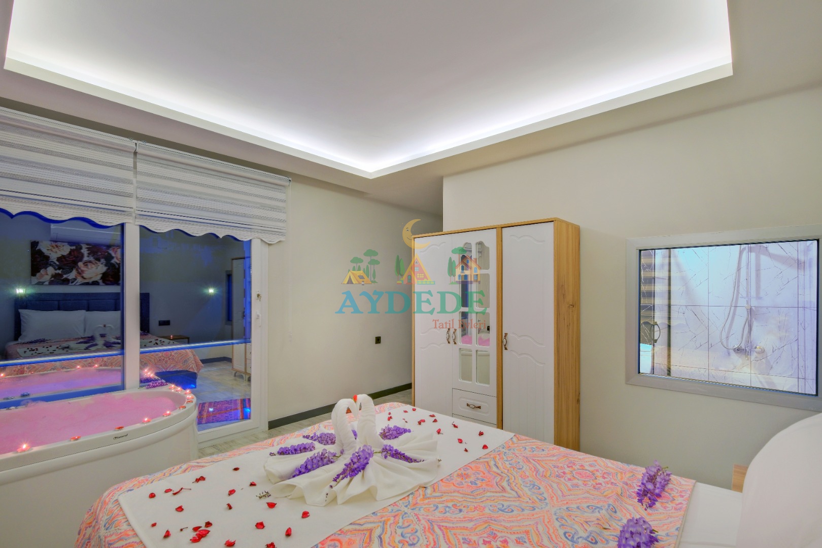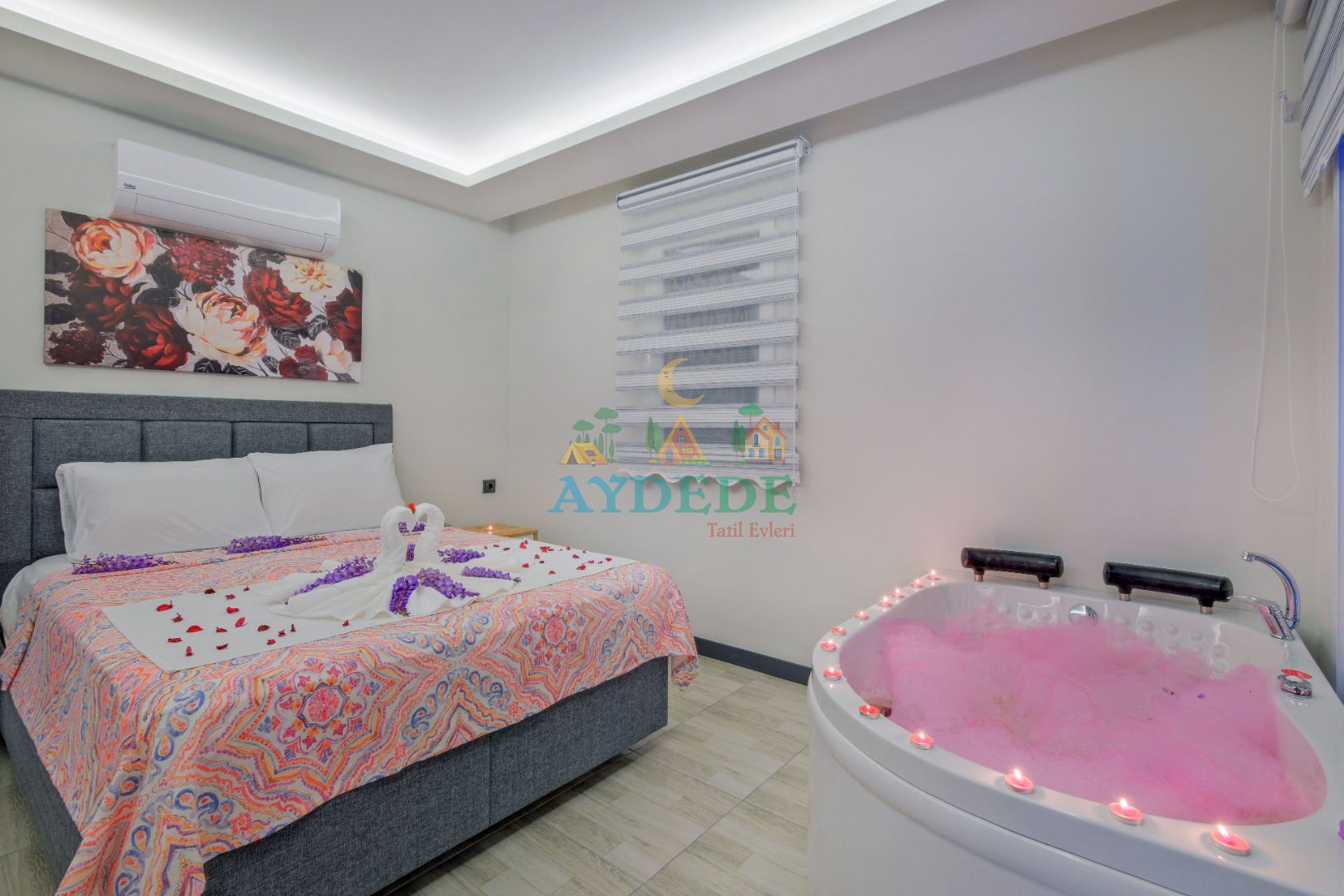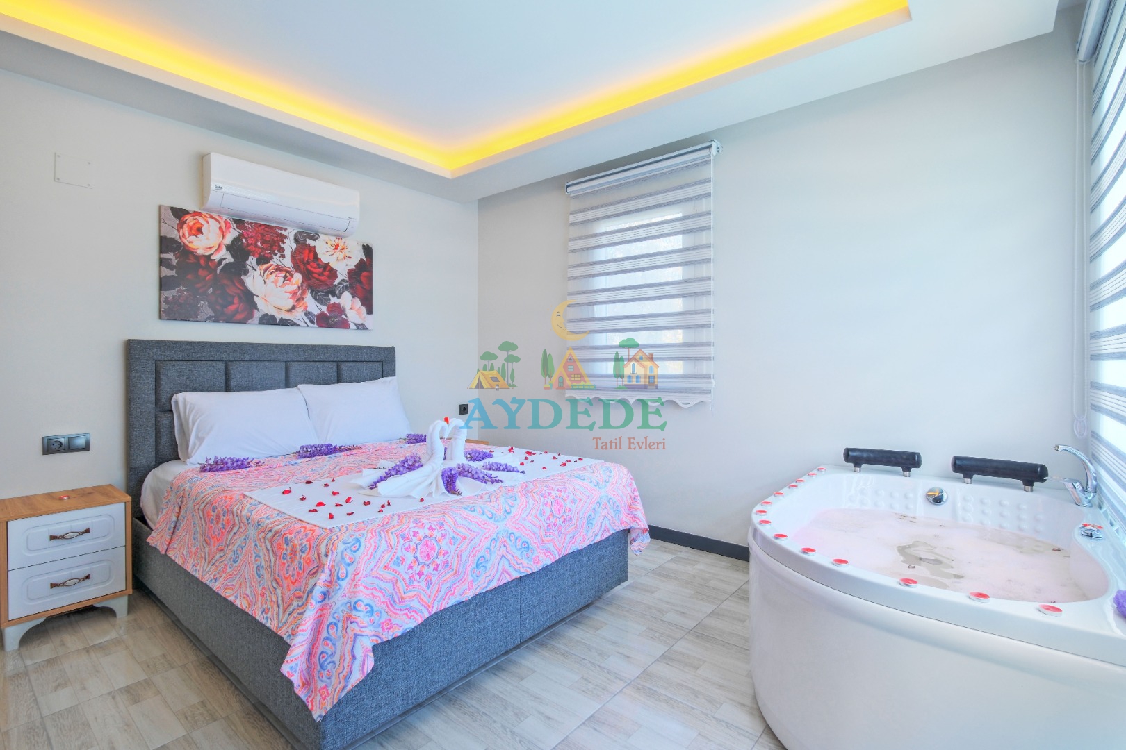 Çift kişilik yatak, ebeveyn banyo, klima, jakuzi