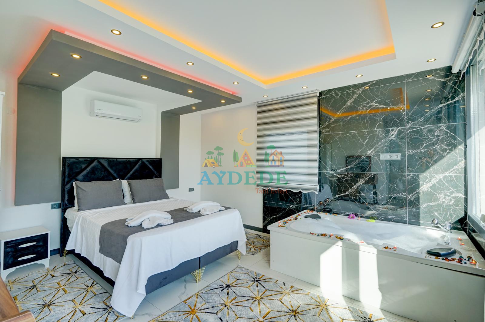 Çift kişilik yatak, ebeveyn banyo, klima, jakuzi