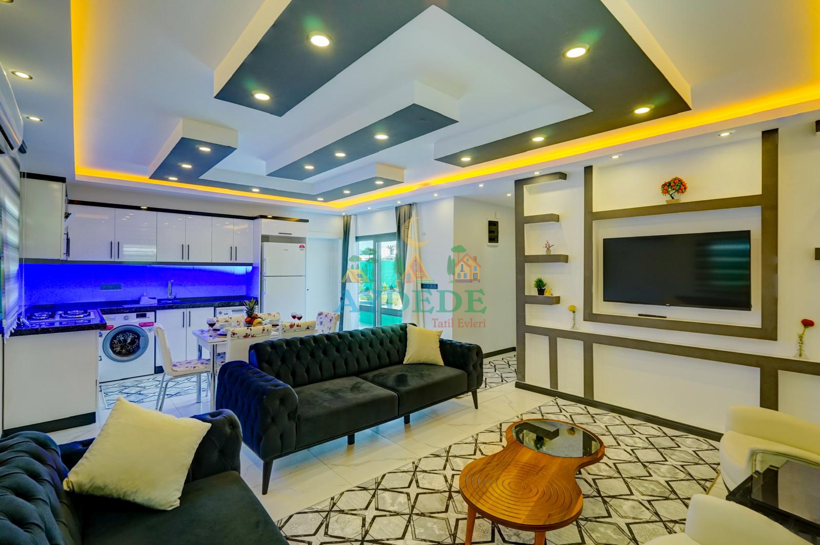 • TV, modern oturma grubu, yemek masası