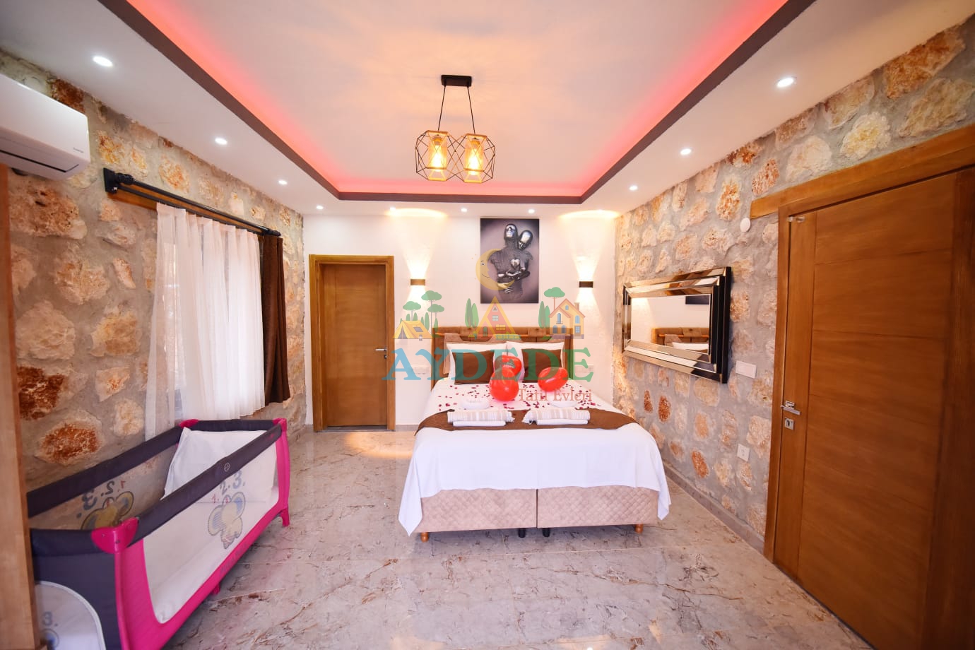 Çift kişilik yatak, klima, komodin, makyaj masası, elbise dolabı, ebeveyn banyosu