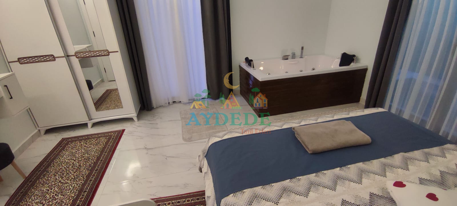 Çift kişilik yatak, ebeveyn banyo, klima, jakuzi