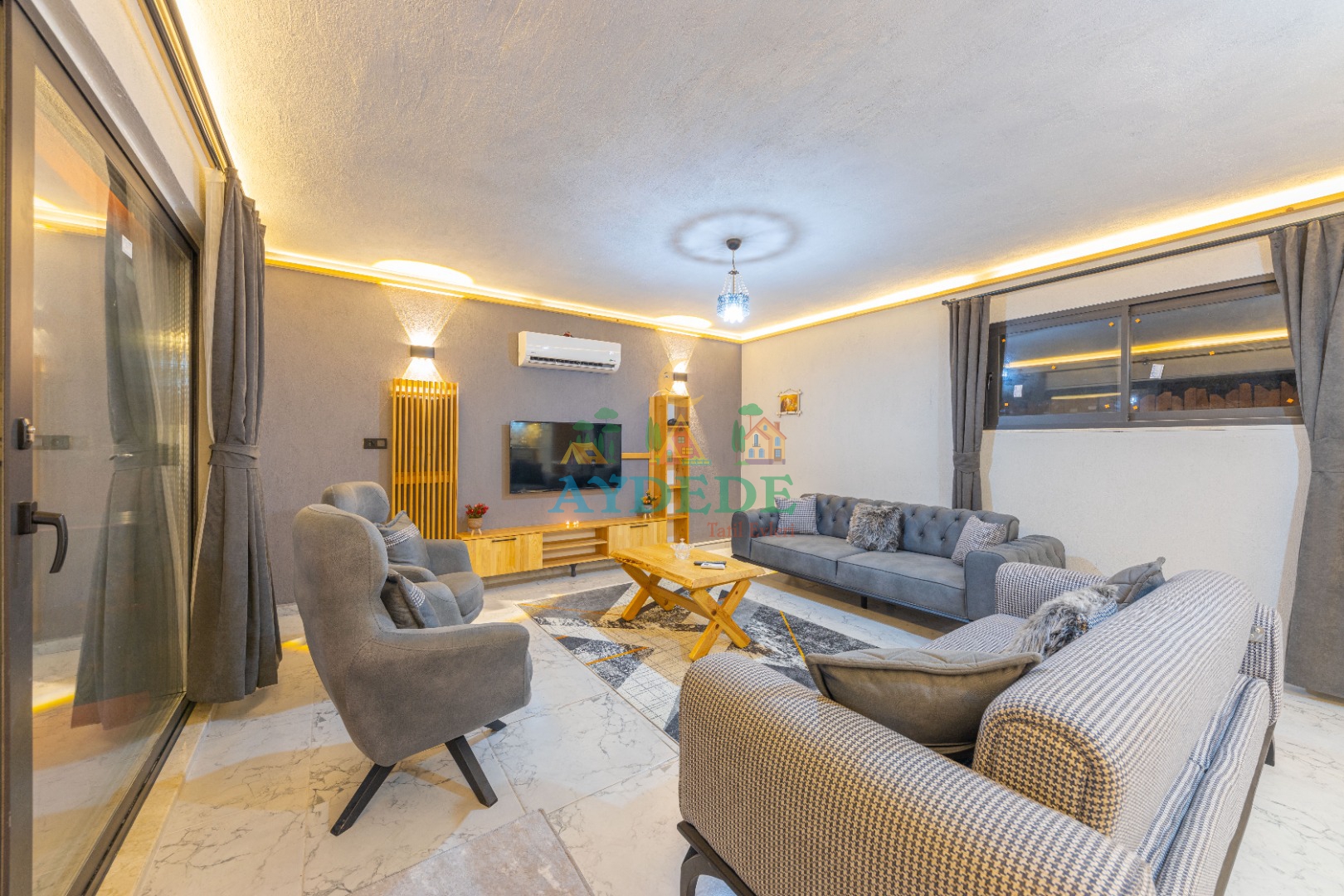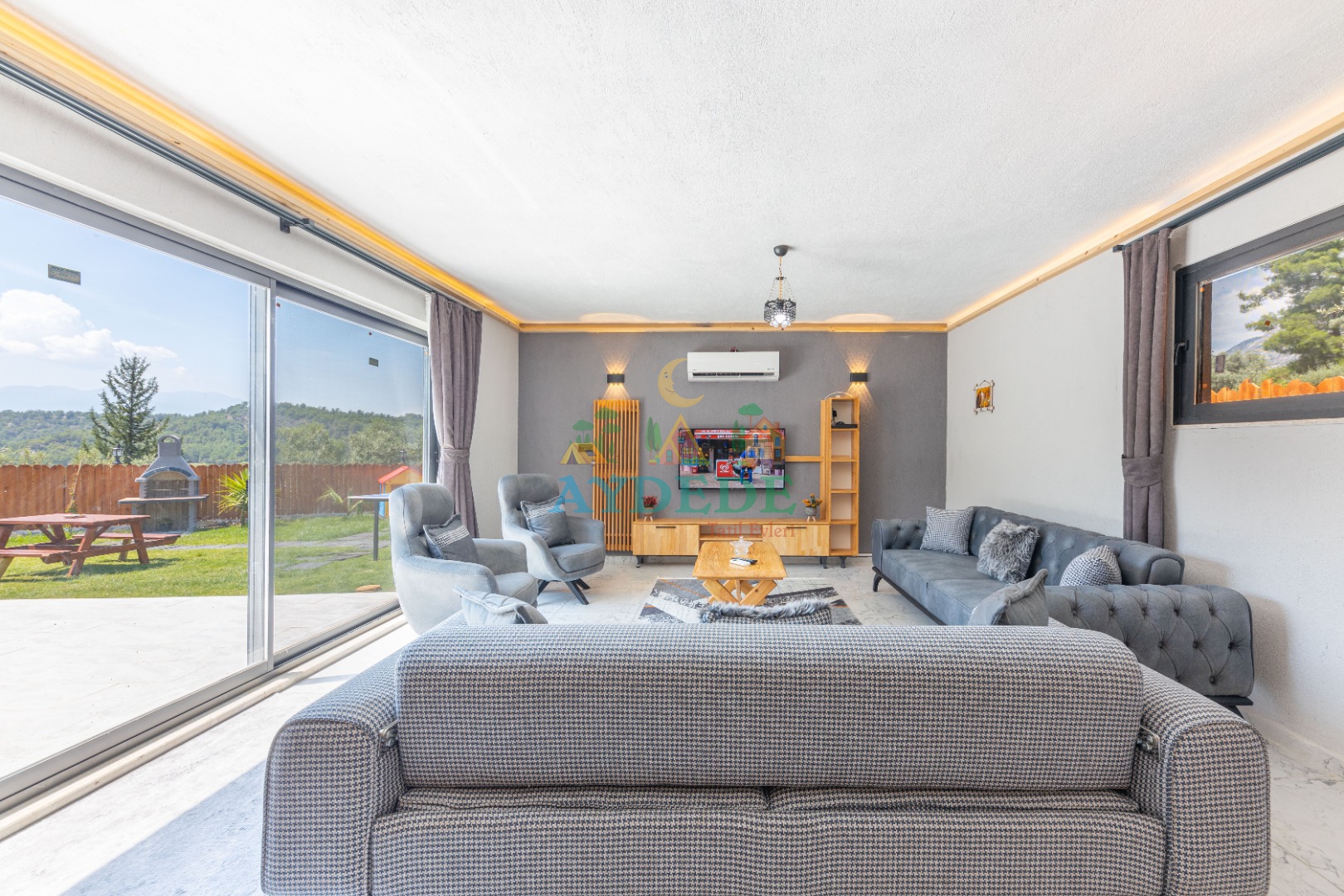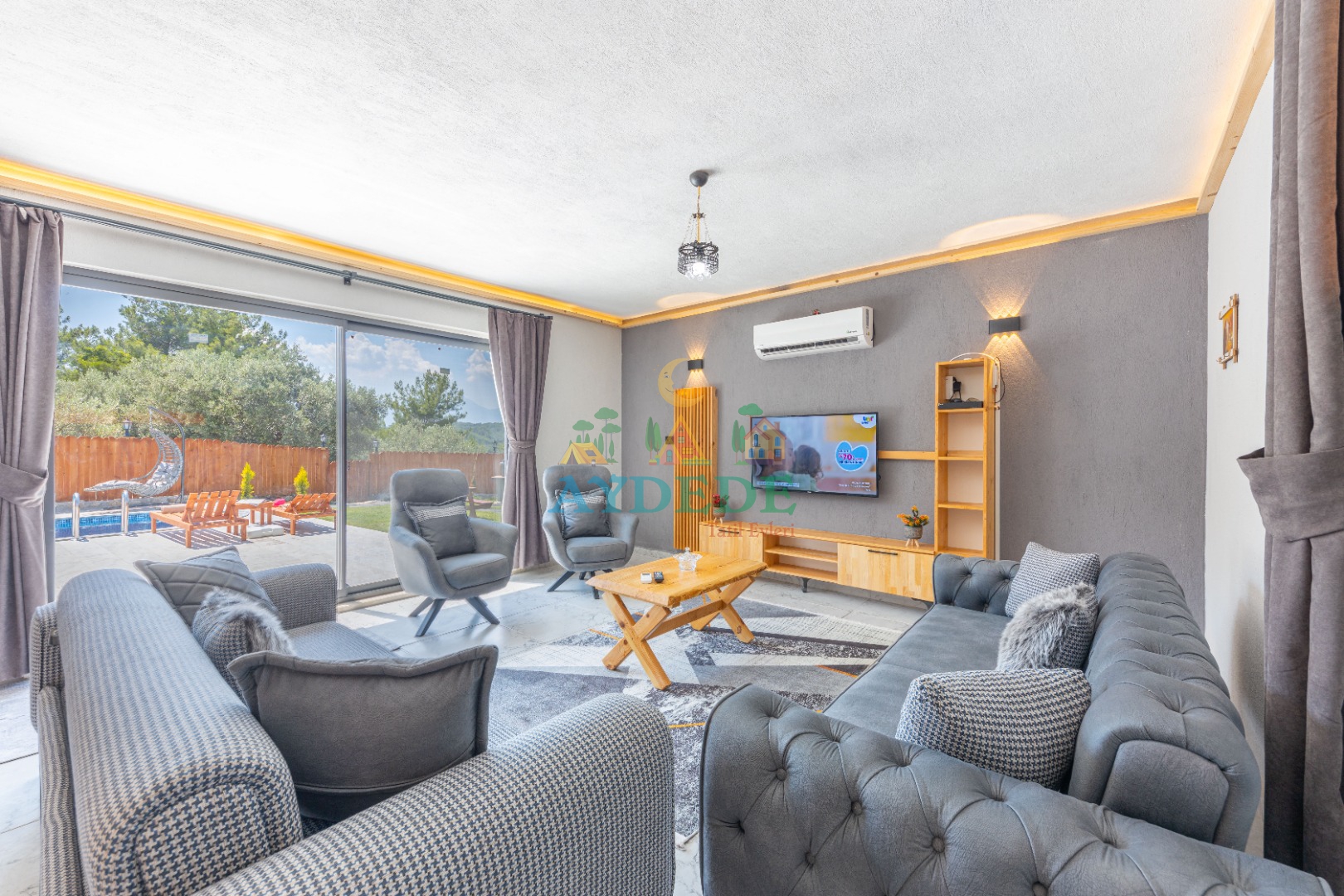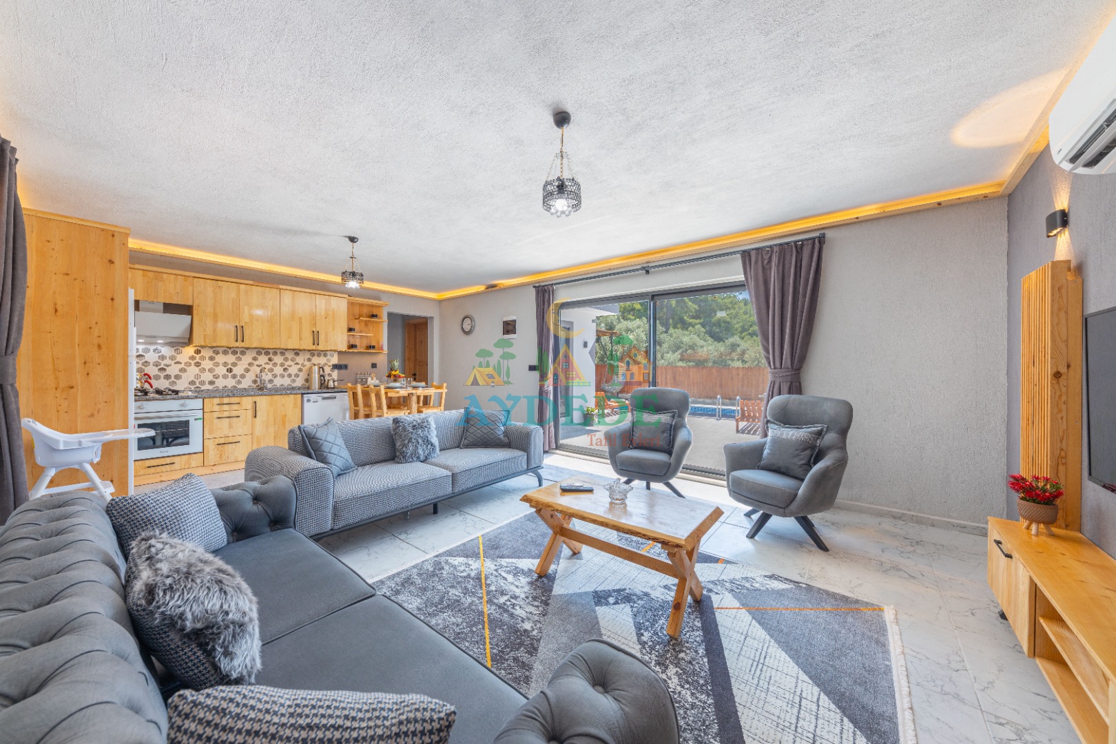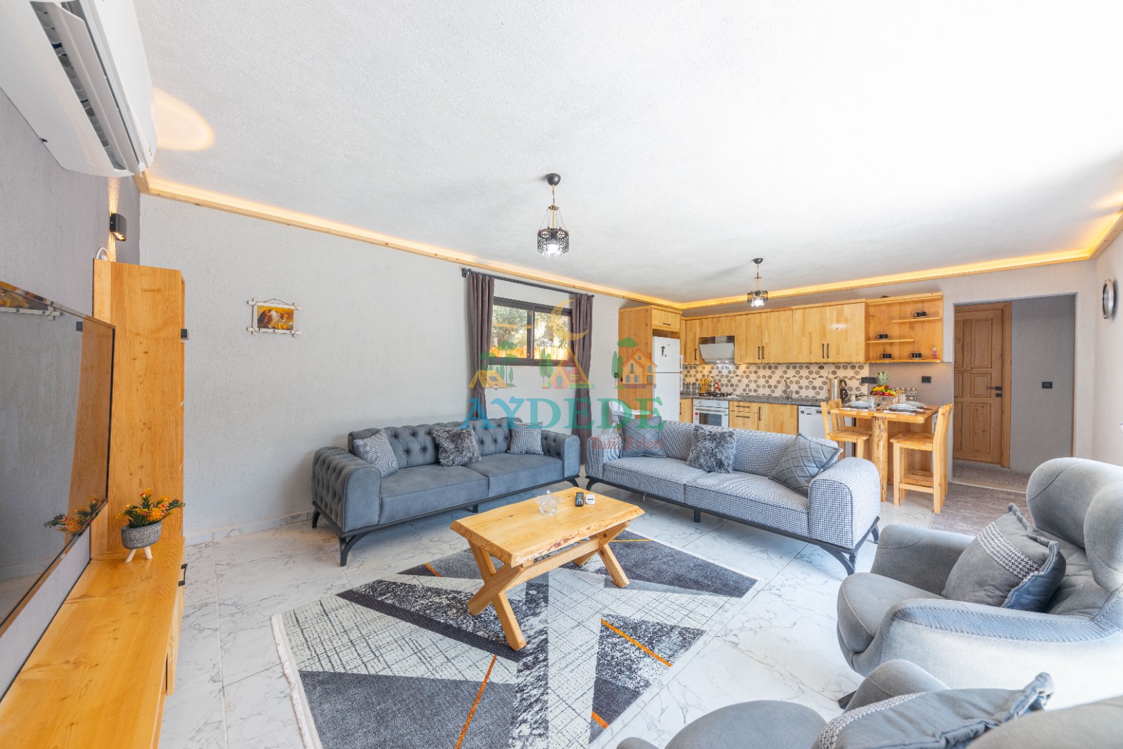 • Salonda klima, TV, oturma grubu, sehpa, mama sandalyesi