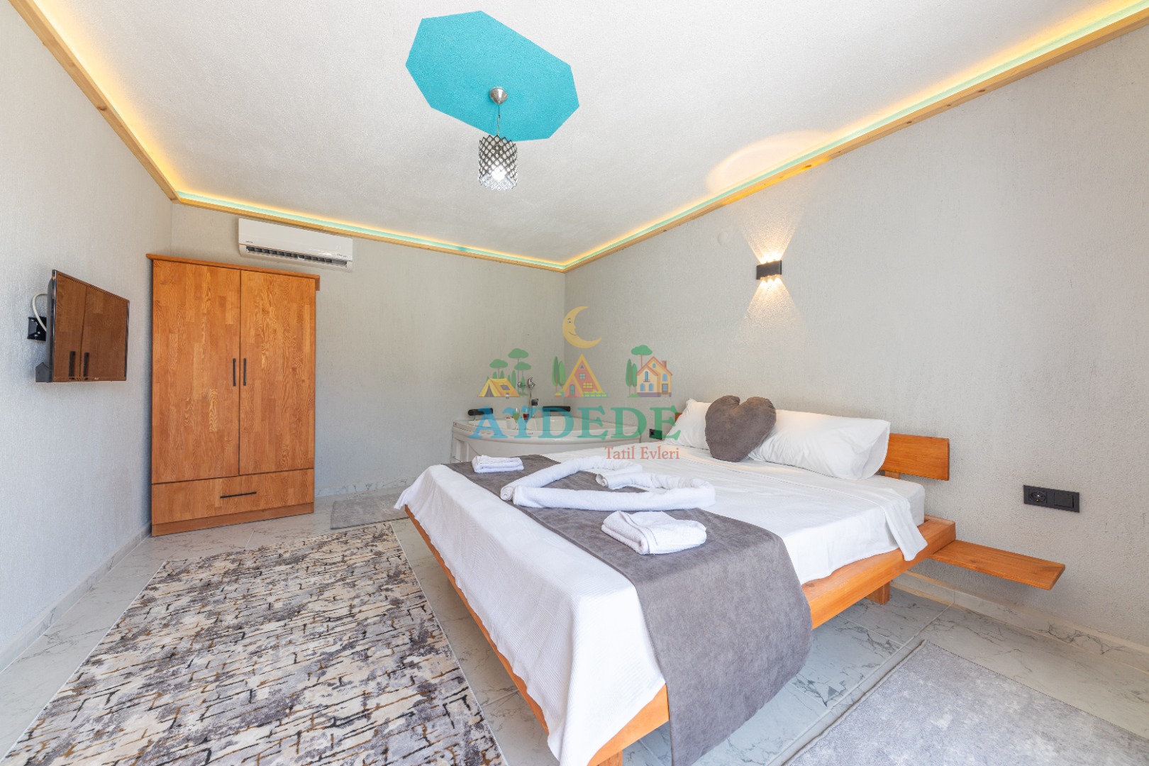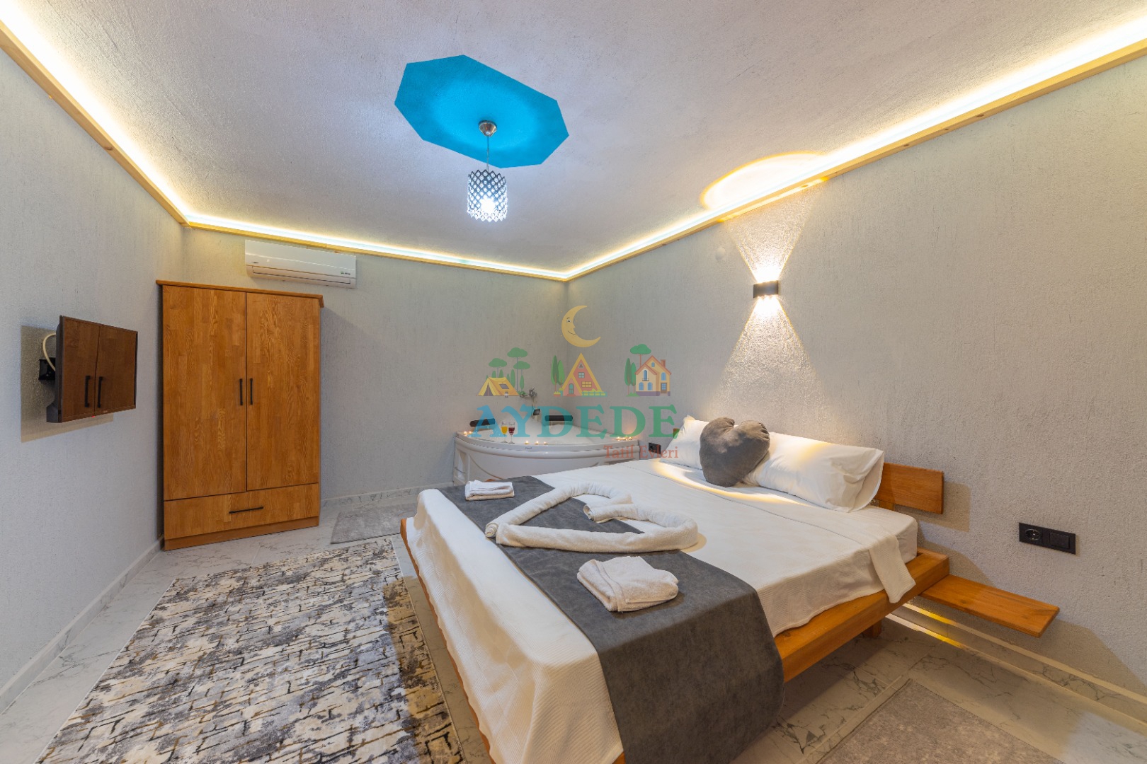 Çift kişilik yatak, klima, TV, jakuzi, elbise dolabı, ebeveyn banyo & WC