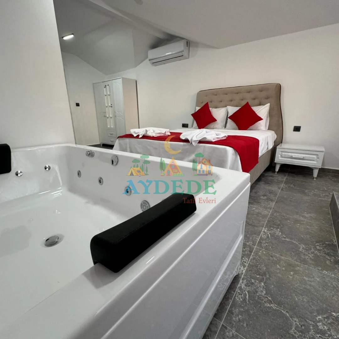 Çift kişilik yatak, komodin, elbise dolabı, klima, ebeveyn banyosu ve jakuzi
