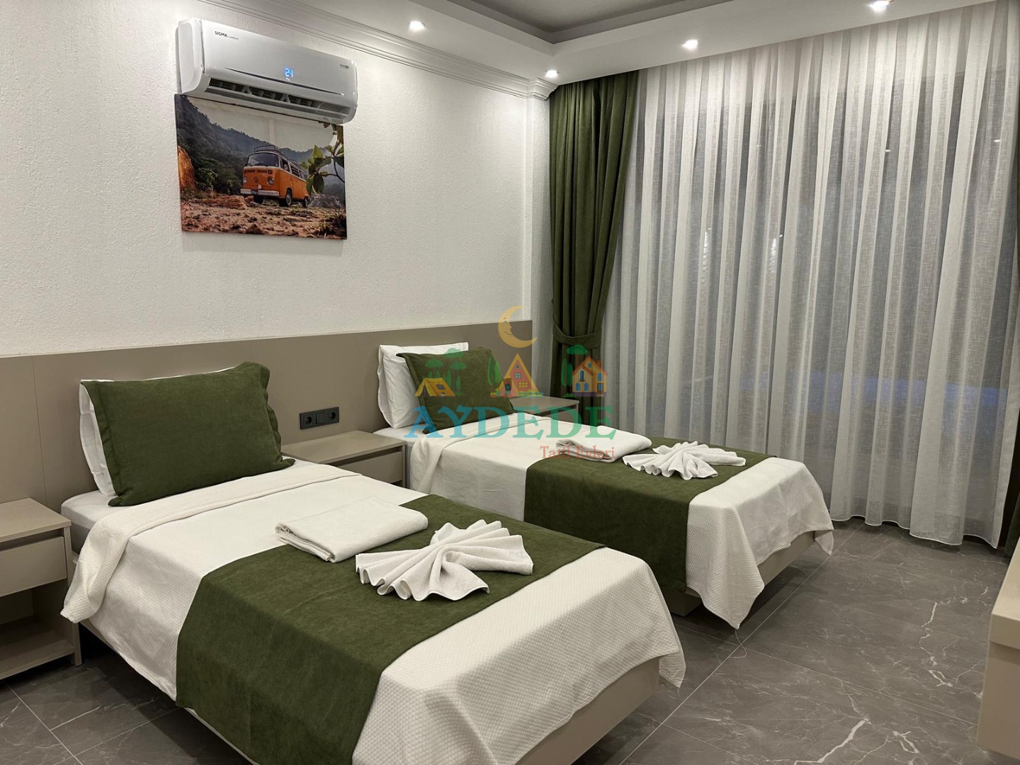2 adet tek kişilik yatak, klima, banyo & WC, doğa manzaralı