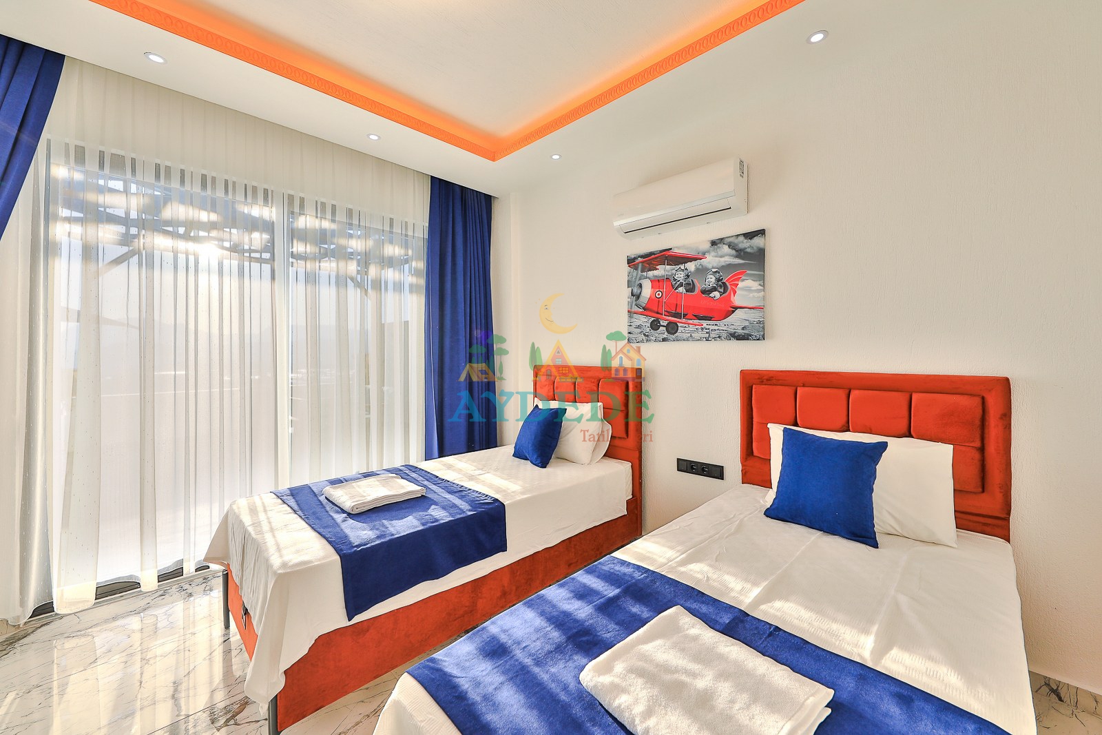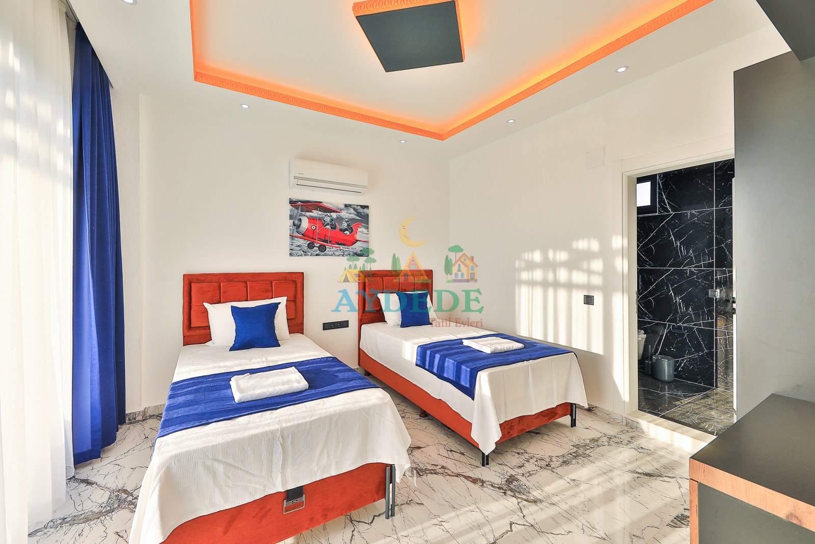 2 adet tek kişilik yatak, klima, banyo & WC