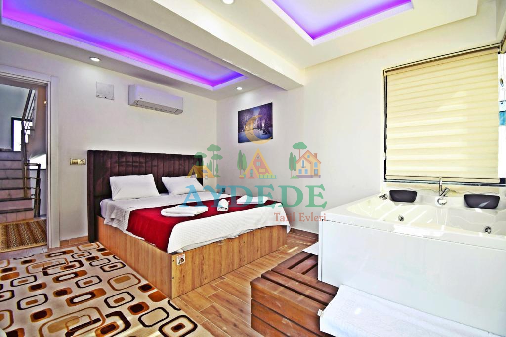 Çift kişilik yatak, klima, jakuzi, elbise dolabı, makyaj masası, balkon