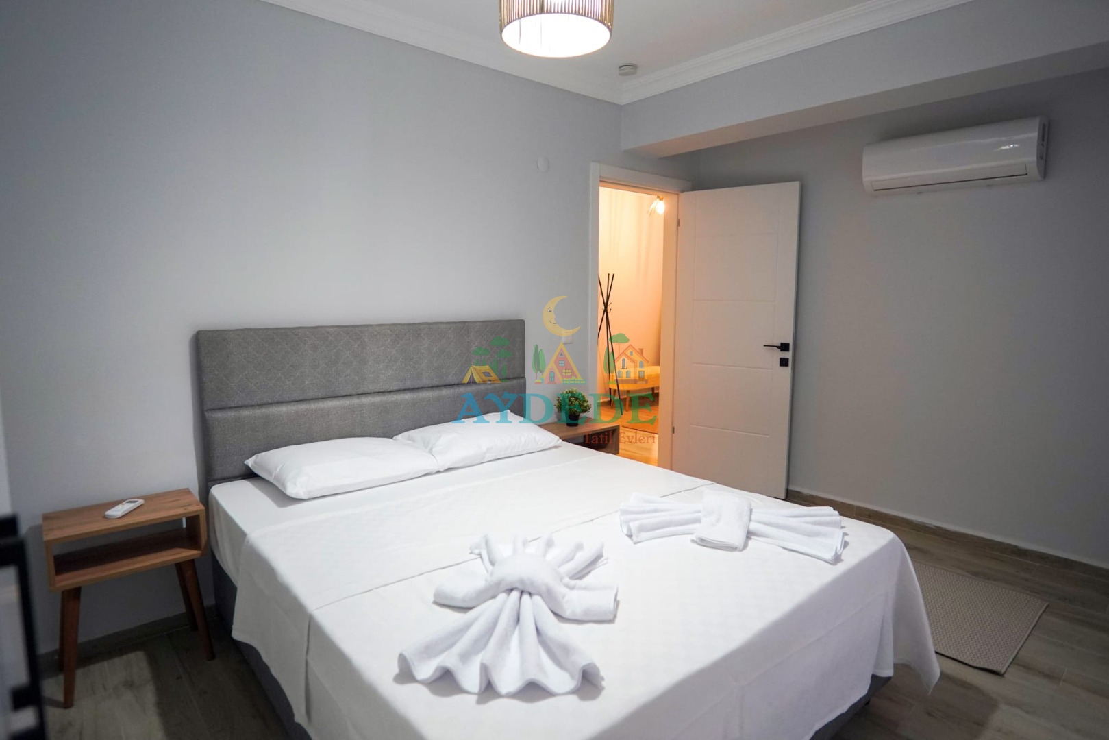 1. Yatak odası (zemin kat): 1 adet çift kişilik yatak,klima,ebeveyn banyo