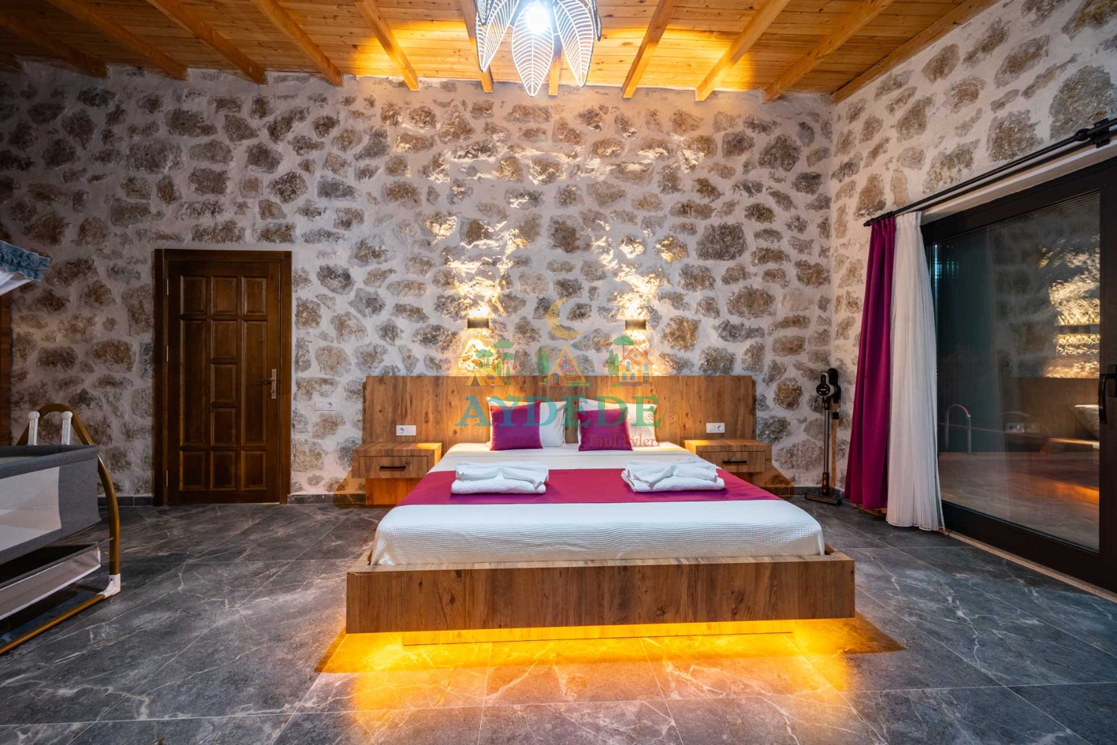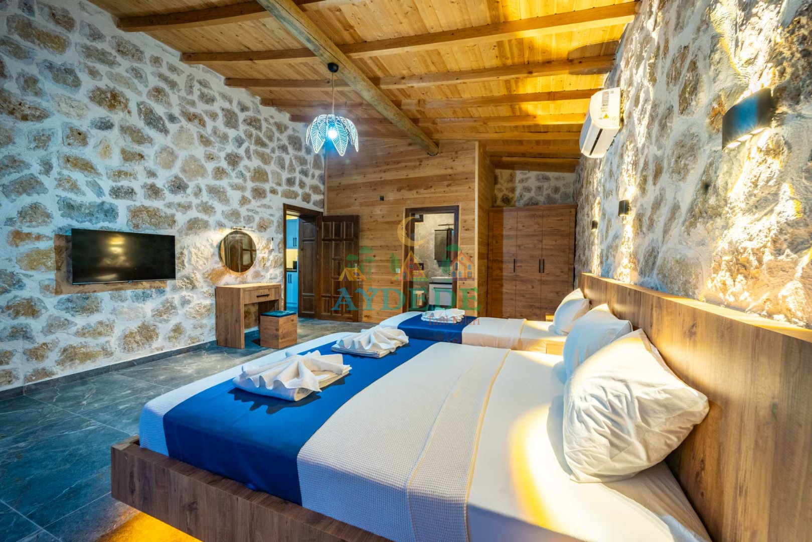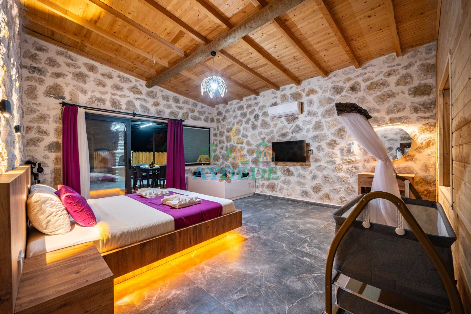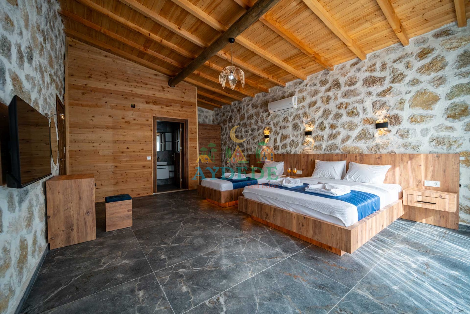 Çift kişilik yatak + tek kişilik yatak + bebek park yatak, klima, TV, ebeveyn banyo/WC, makyaj masası