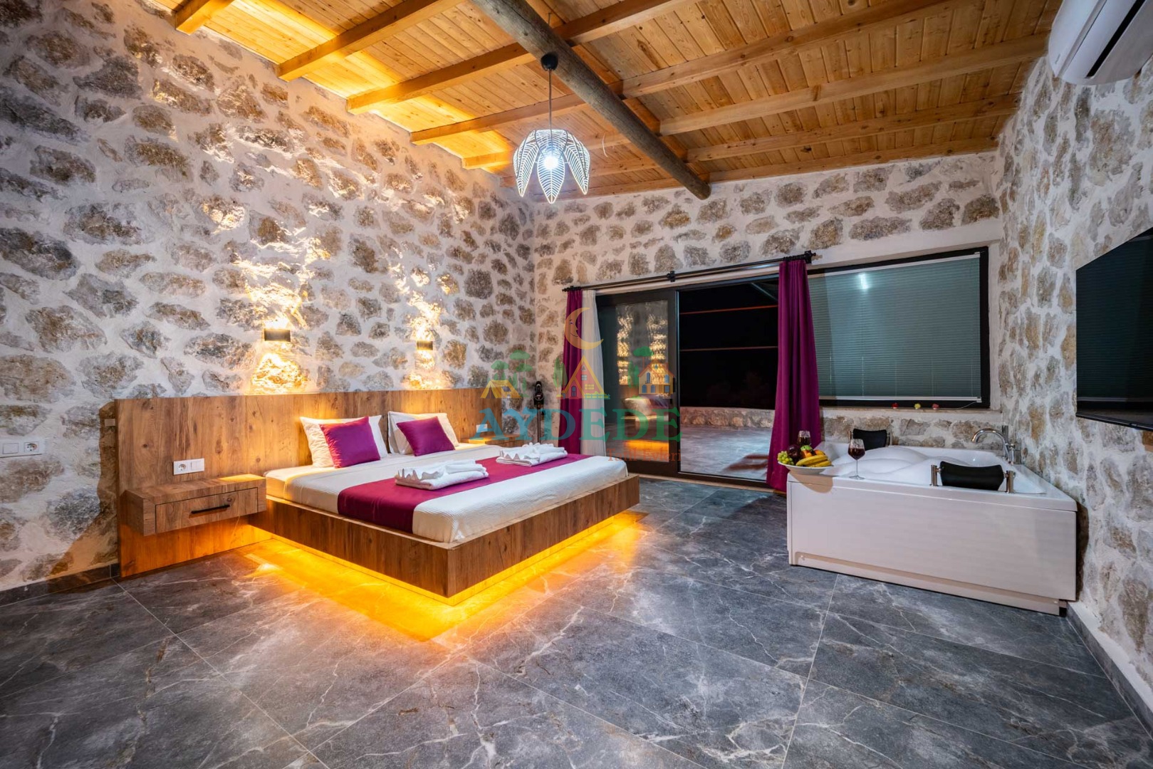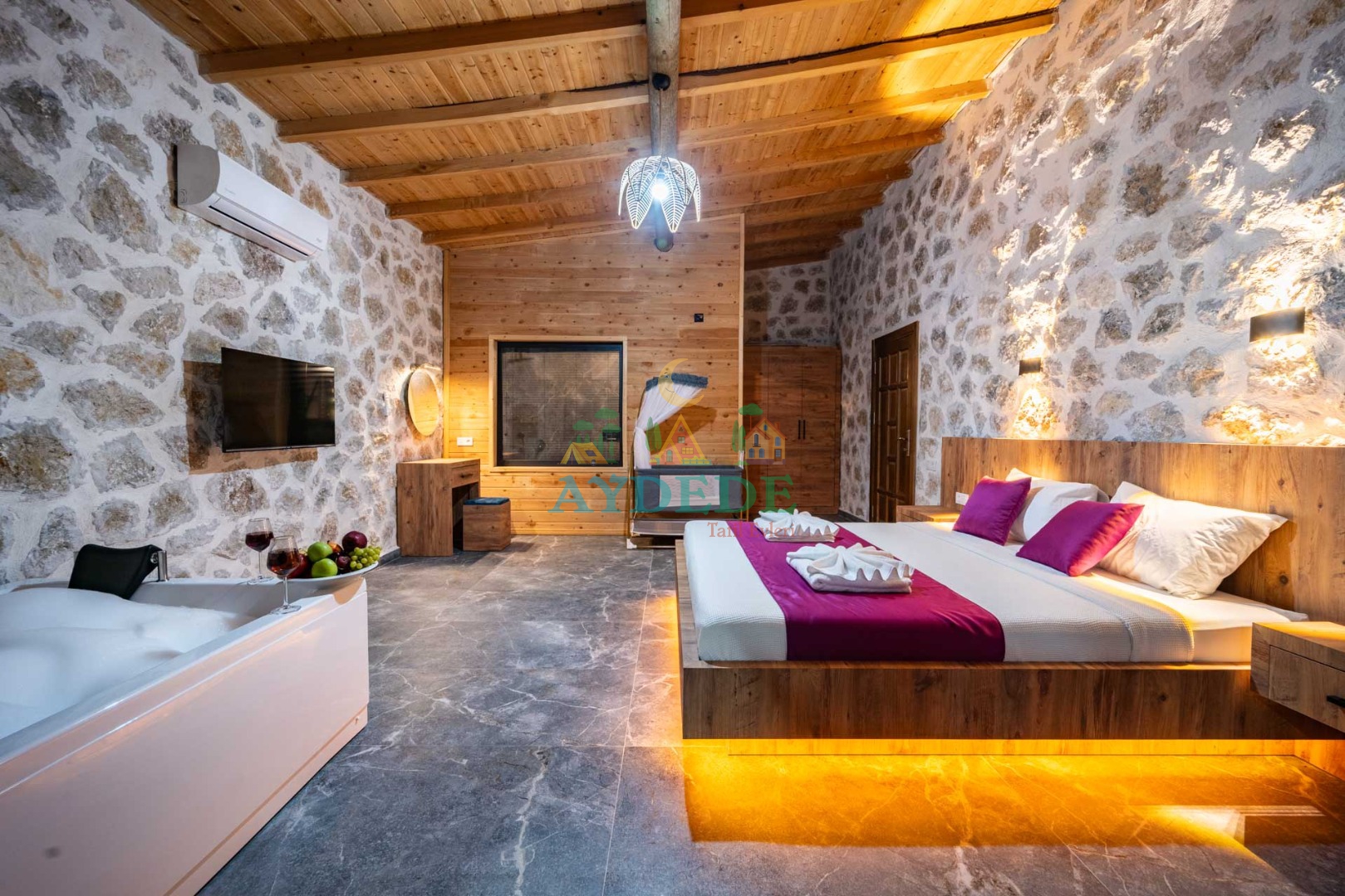 Çift kişilik yatak, klima, TV, jakuzi, ebeveyn banyo/WC, makyaj masası