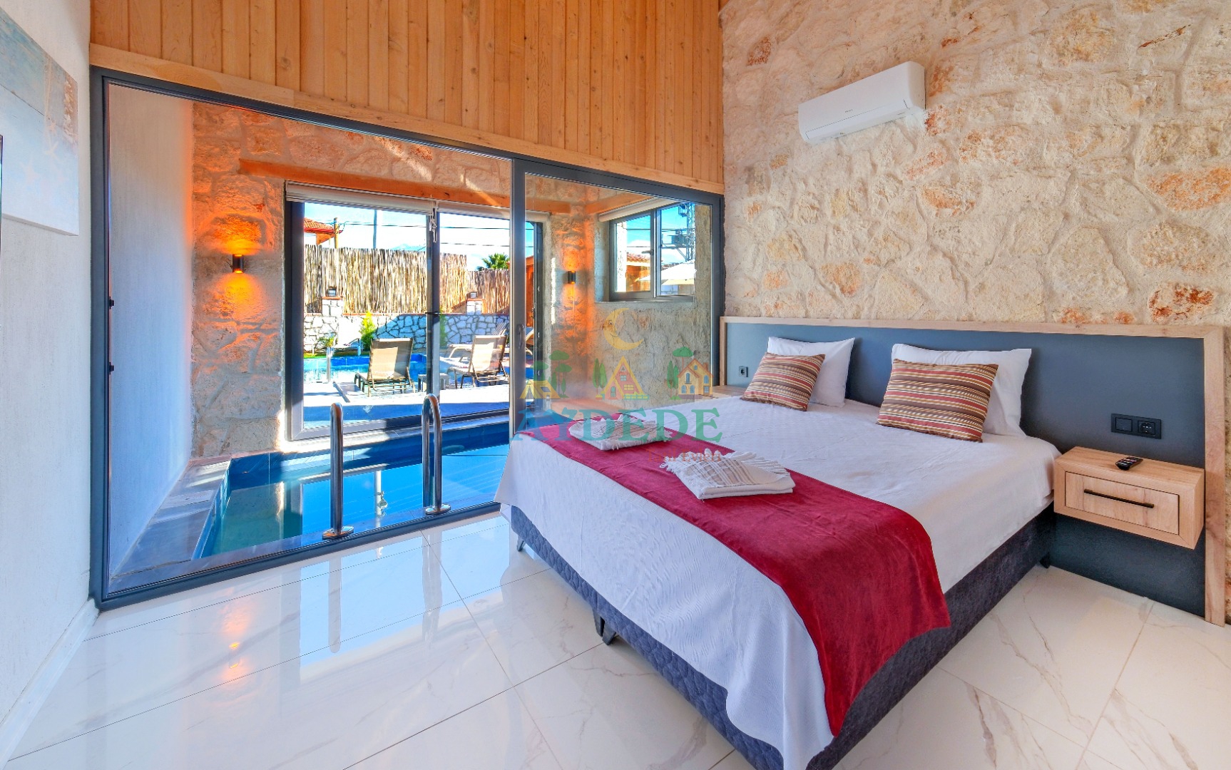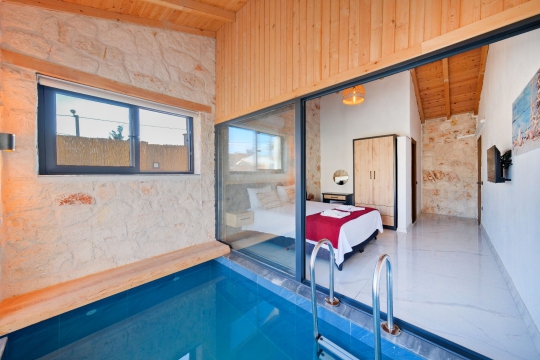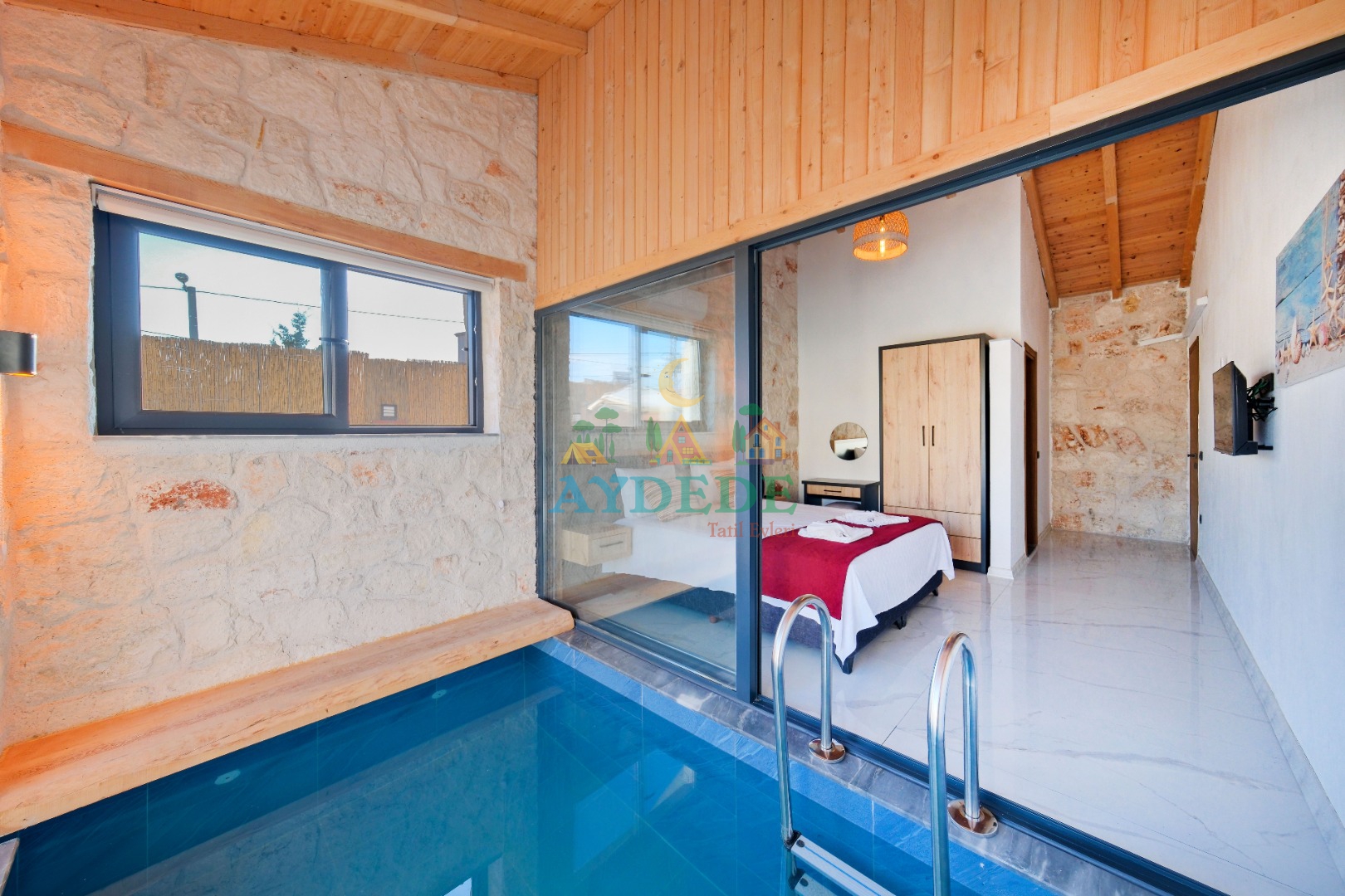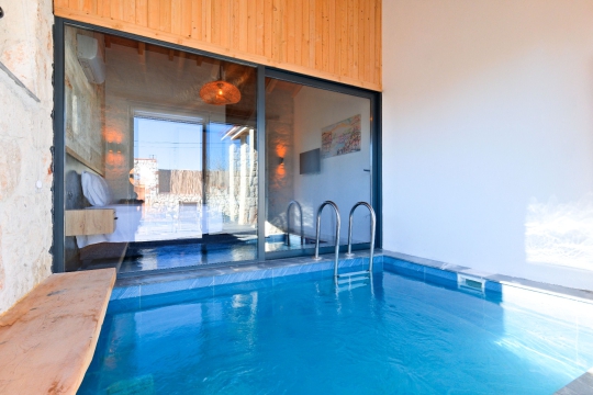 Çift kişilik yatak, ebeveyn banyo, klima, oda içerisinde kapalı ısıtmalı havuz