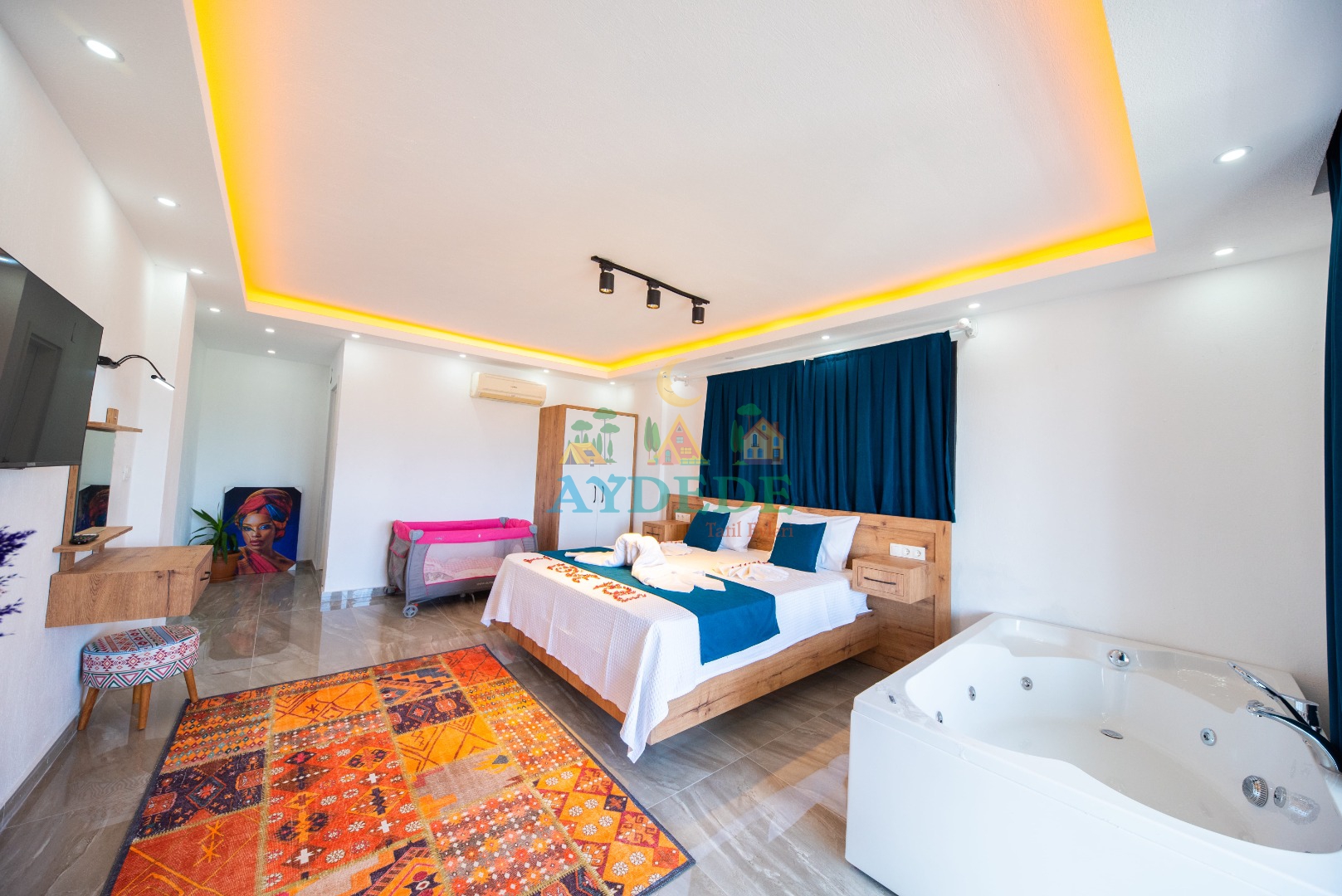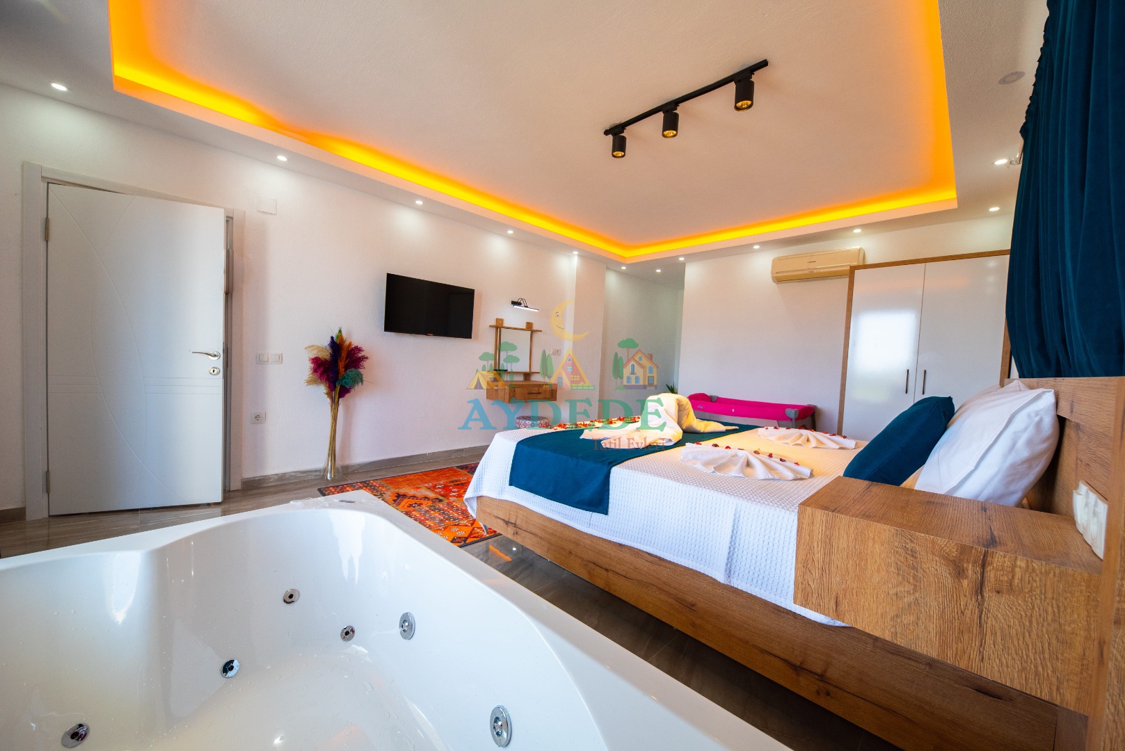 Çift kişilik yatak, ebeveyn banyosu, klima, TV, jakuzi