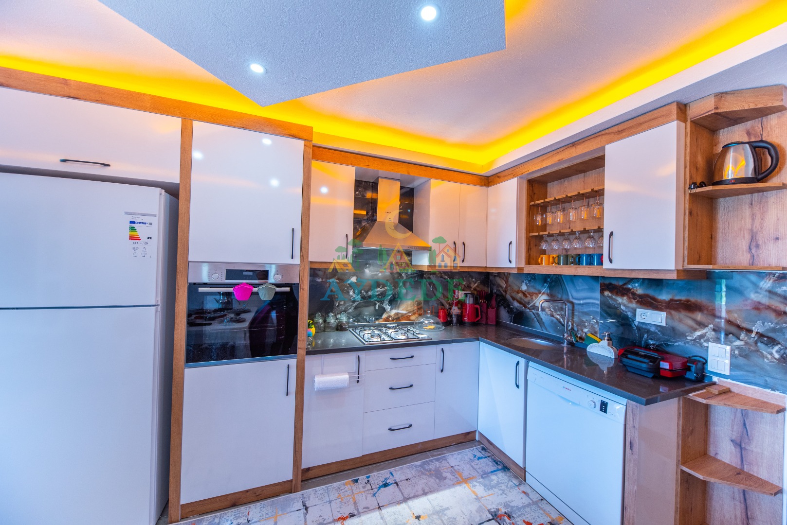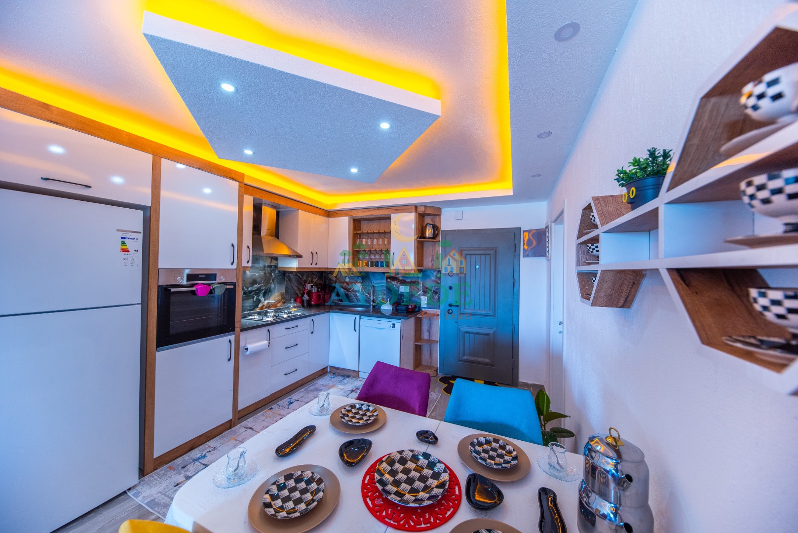 • Açık plan mutfakta buzdolabı, bulaşık makinesi, çamaşır makinesi, fırın, ocak ve mutfak ekipmanları mevcuttur