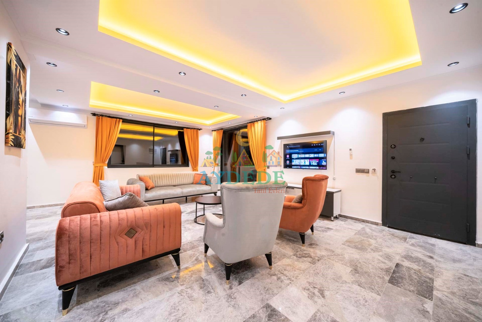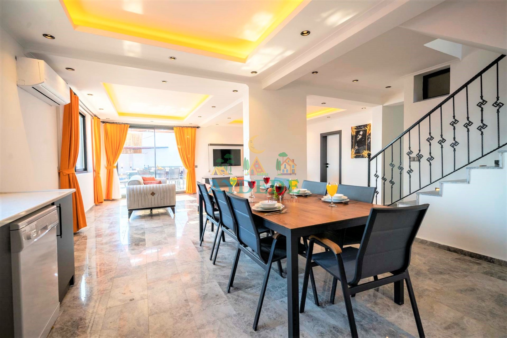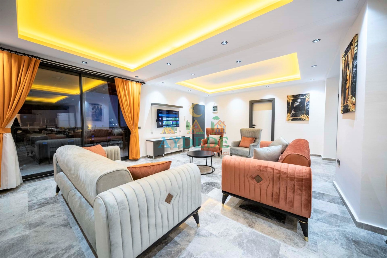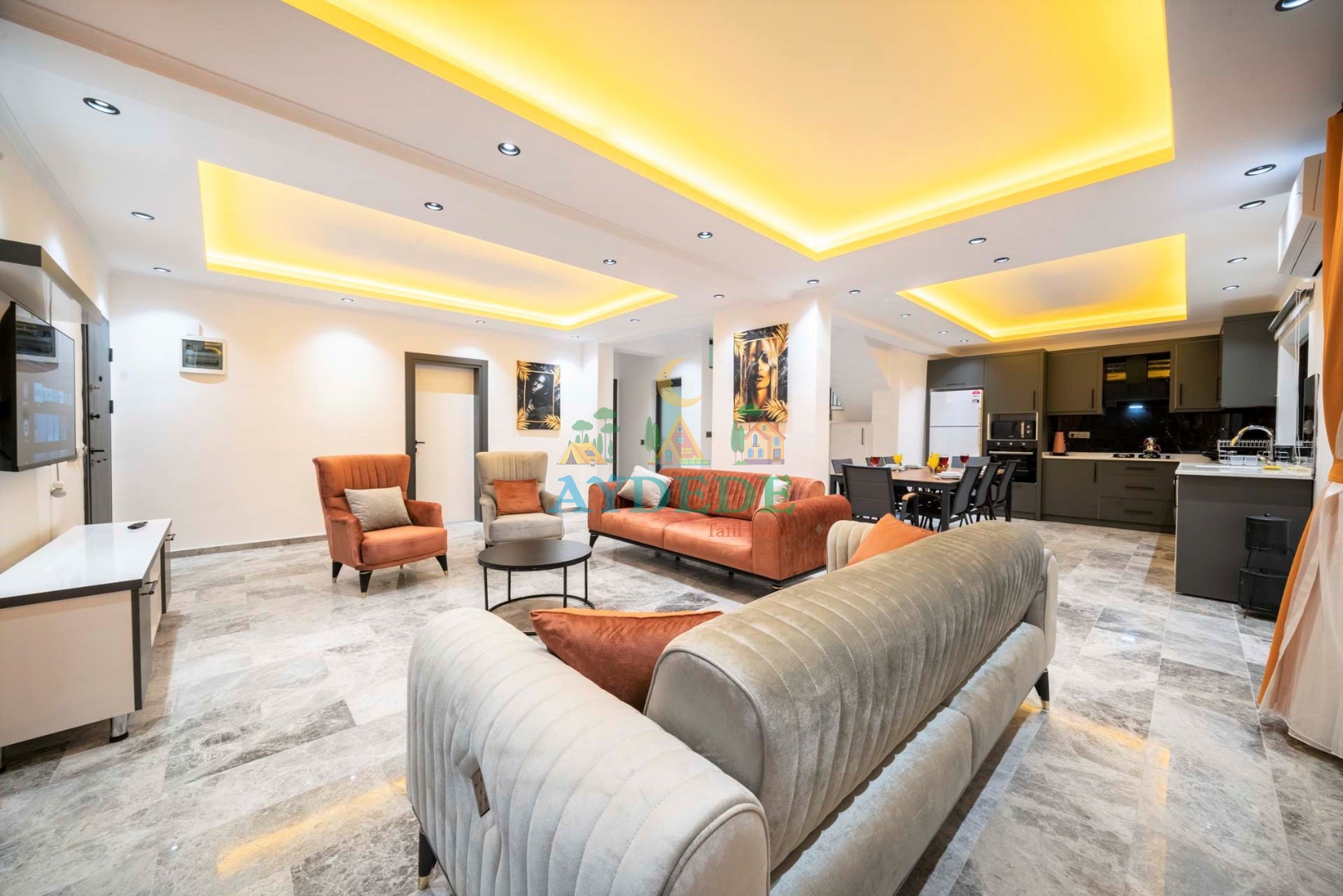 • TV, modern oturma grubu, yemek masası