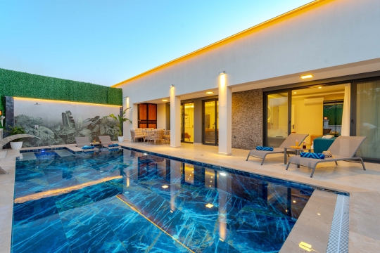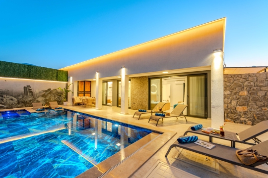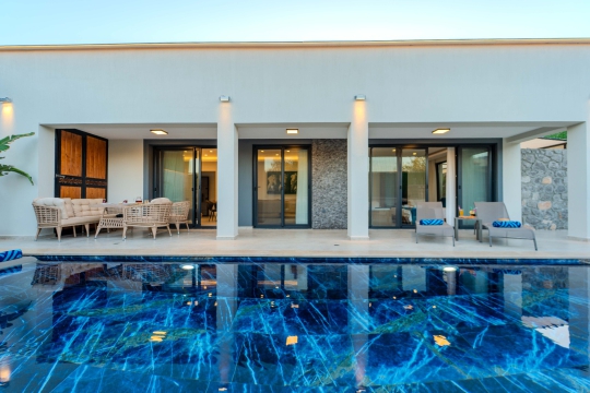 Villa Resital 1 ve Villa Resital 2, Fethiye’nin Eldirek mevkiinde, yan yana konumlanmış ve birebir aynı özelliklere sahip iki özel villadır. Sauna, jakuzi, tam donanımlı özel havuz ve geniş yaşam alanlarıyla özellikle geniş aileler ve birlikte tatil yapmak isteyen kalabalık gruplar için oldukça uygun bir seçenektir. Şehir merkezine ve plajlara yakın konumu ile hem sakin hem de ulaşımı kolay bir tatil imkânı sunar.