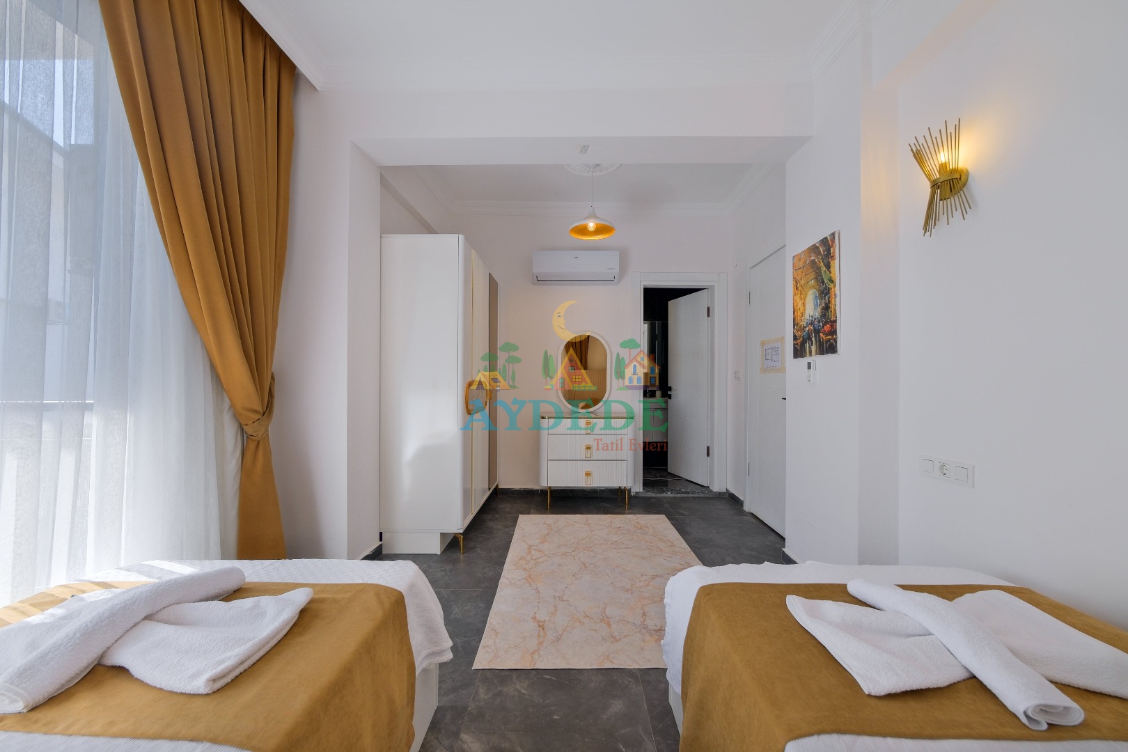 2 adet tek kişilik yatak, klima, banyo