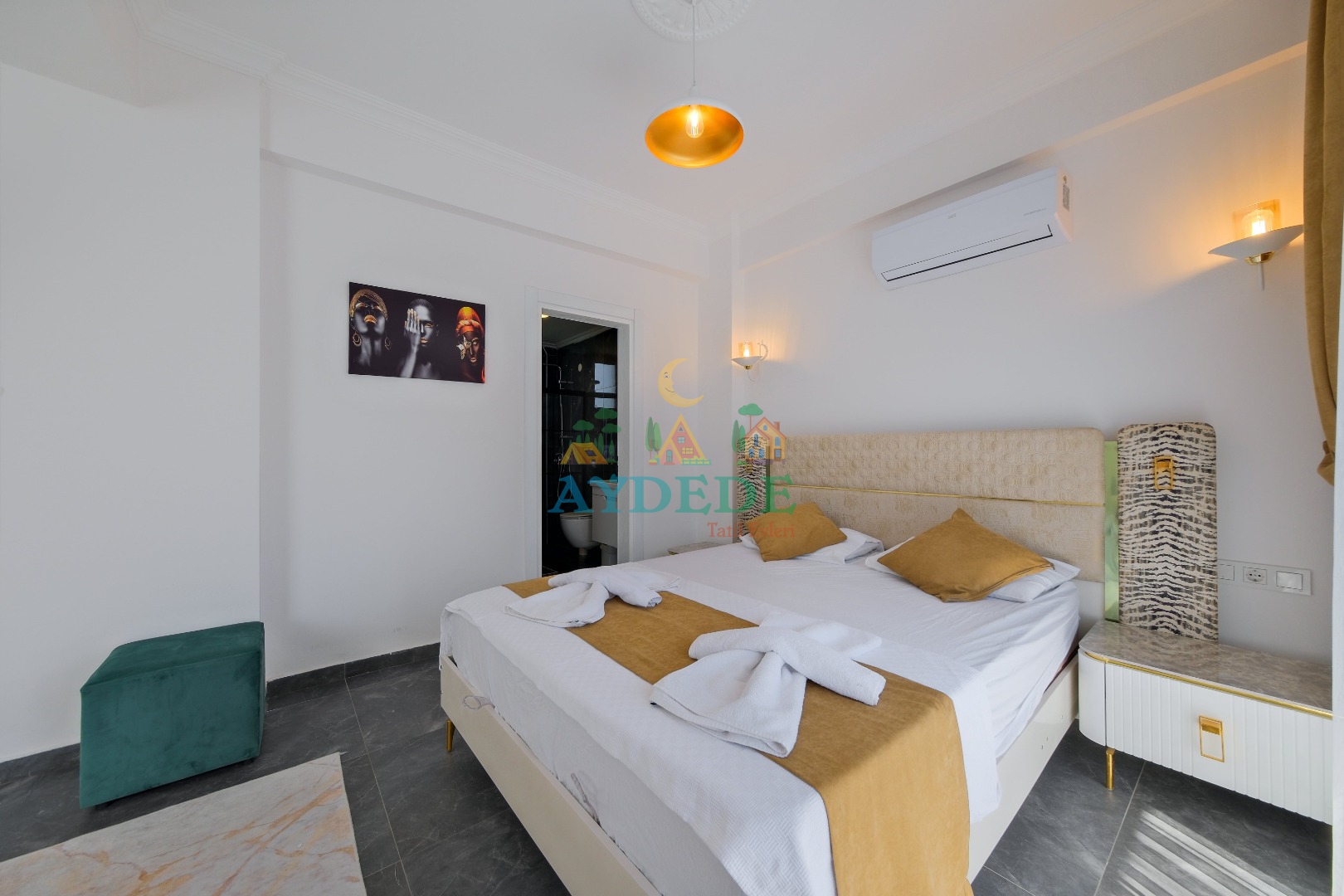 Çift kişilik yatak, klima, ebeveyn banyo