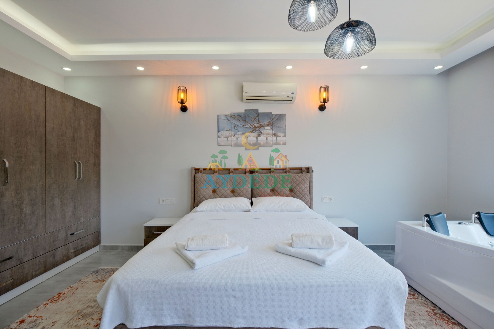 Çift kişilik yatak, elbise dolabı, komodin, klima, LCD TV, jakuzi, ebeveyn banyo/WC, havuz terasına çıkış