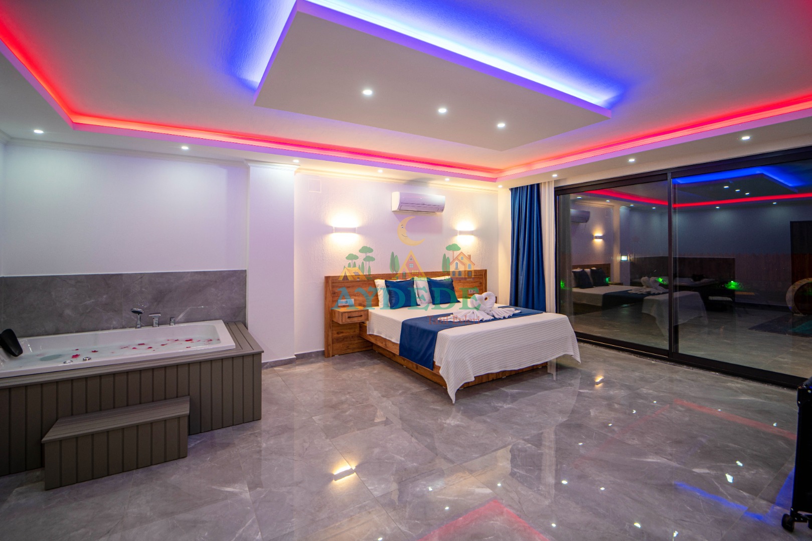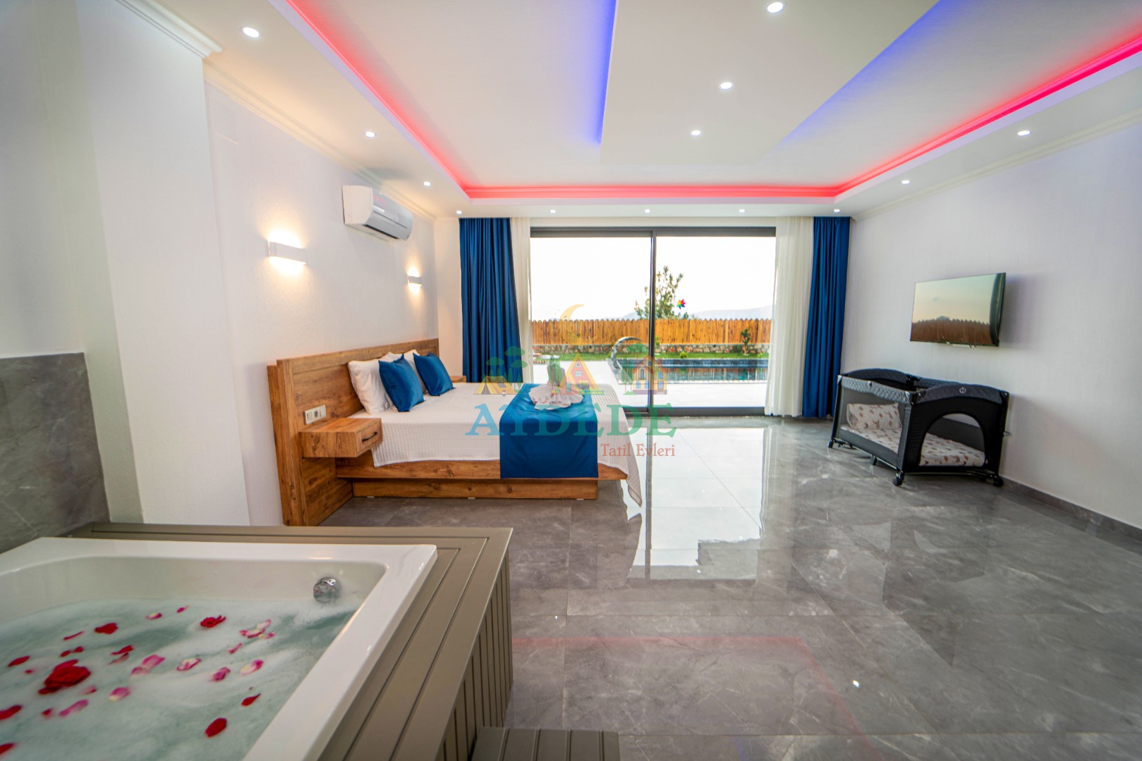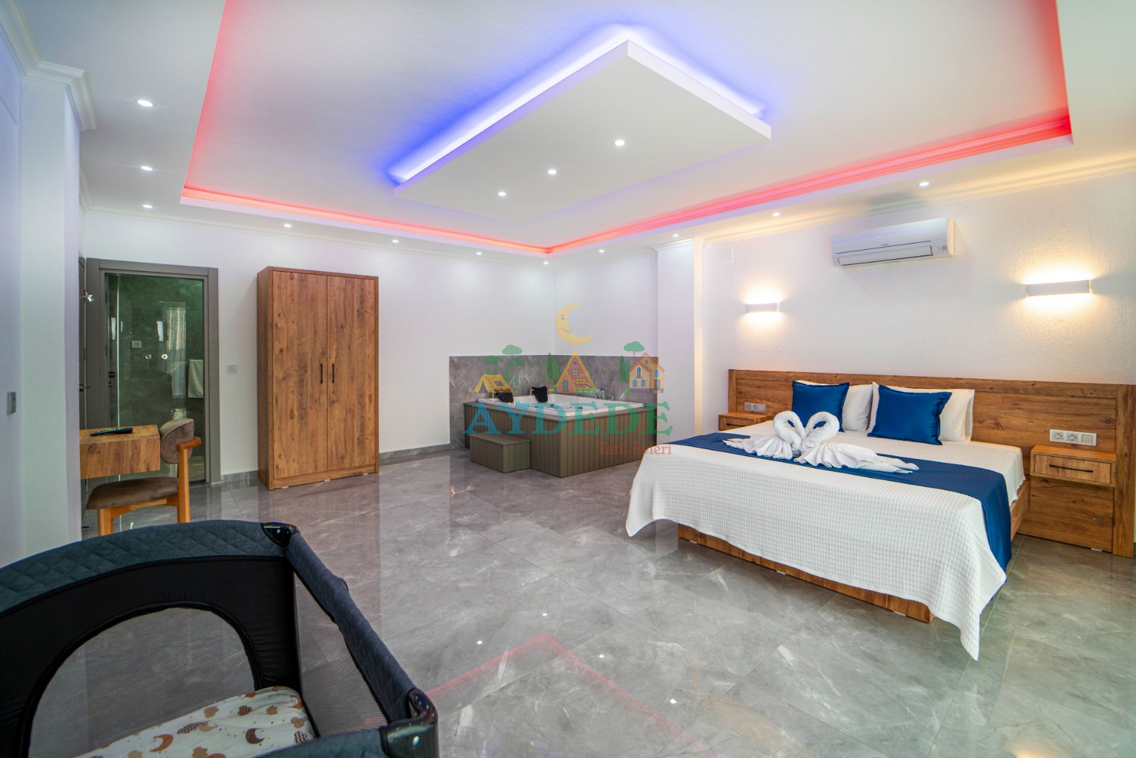 Çift kişilik yatak, ebeveyn banyo, jakuzi, klima