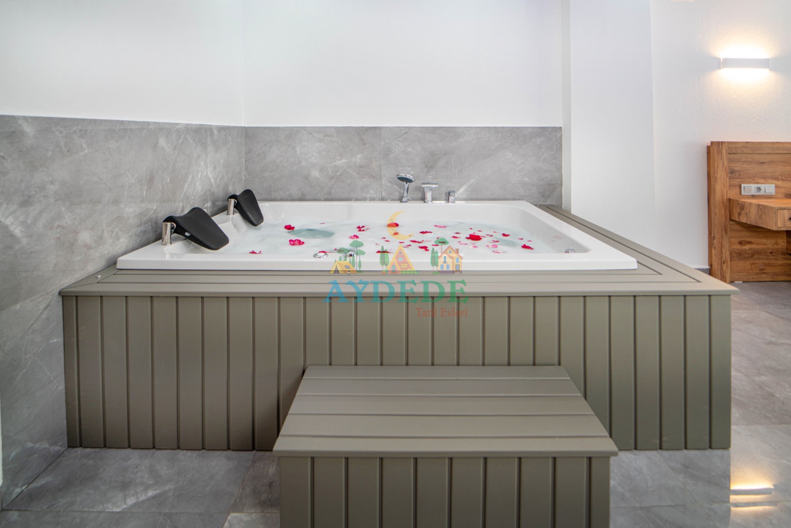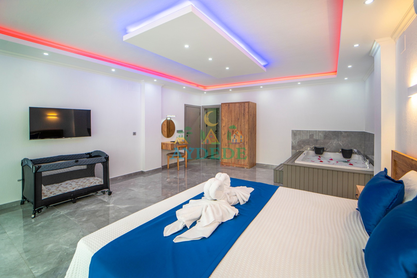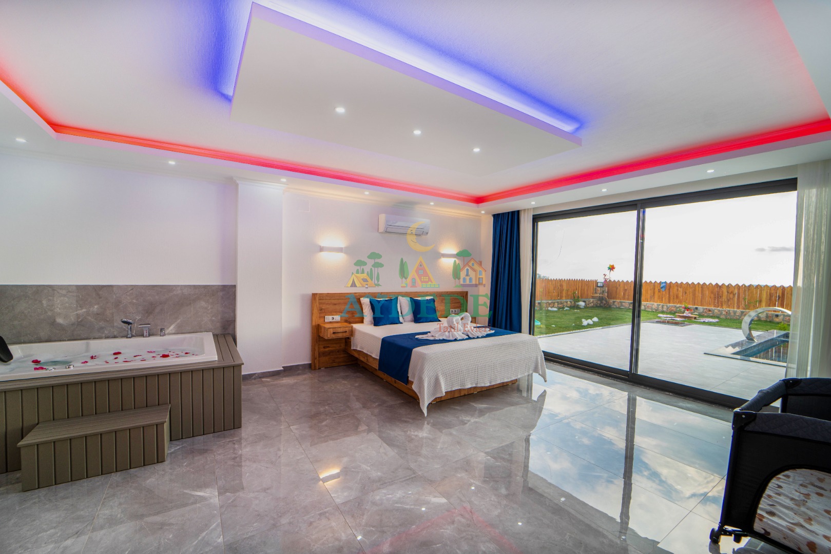 Çift kişilik yatak, ebeveyn banyo, jakuzi, klima
