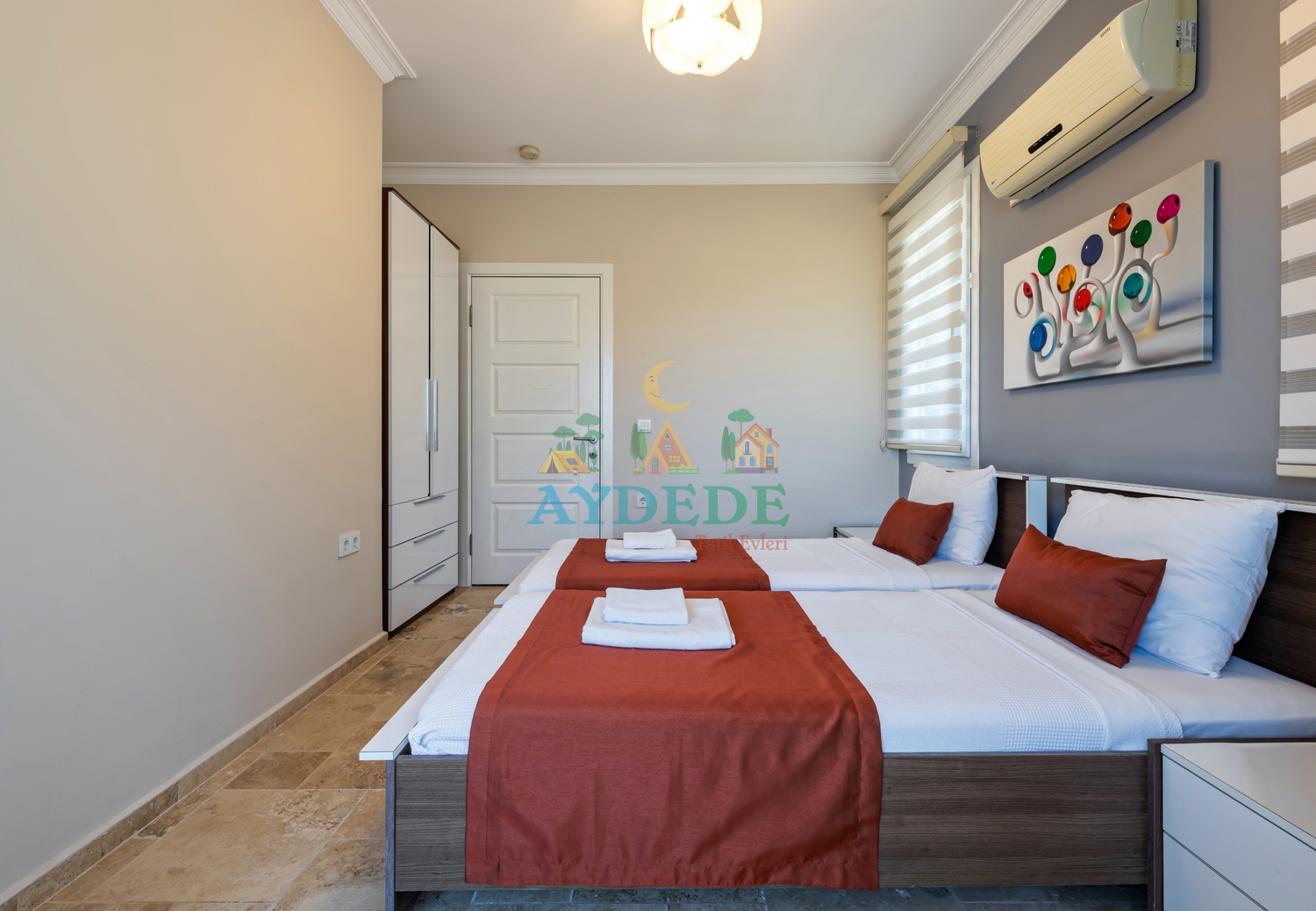 2 adet tek kişilik yatak, elbise dolabı, komodin, klima, katta ortak banyo