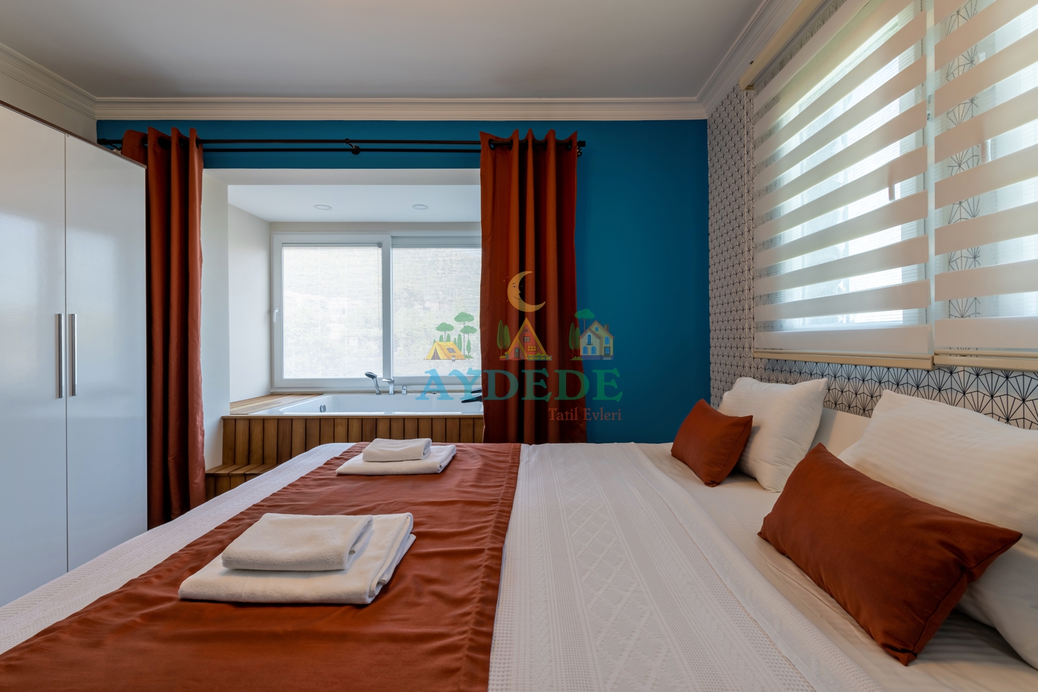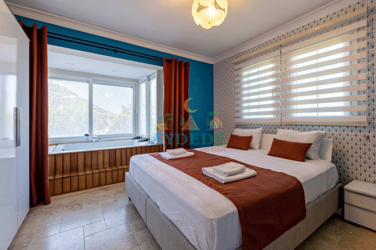 Çift kişilik yatak, elbise dolabı, komodin, klima, jakuzili banyo